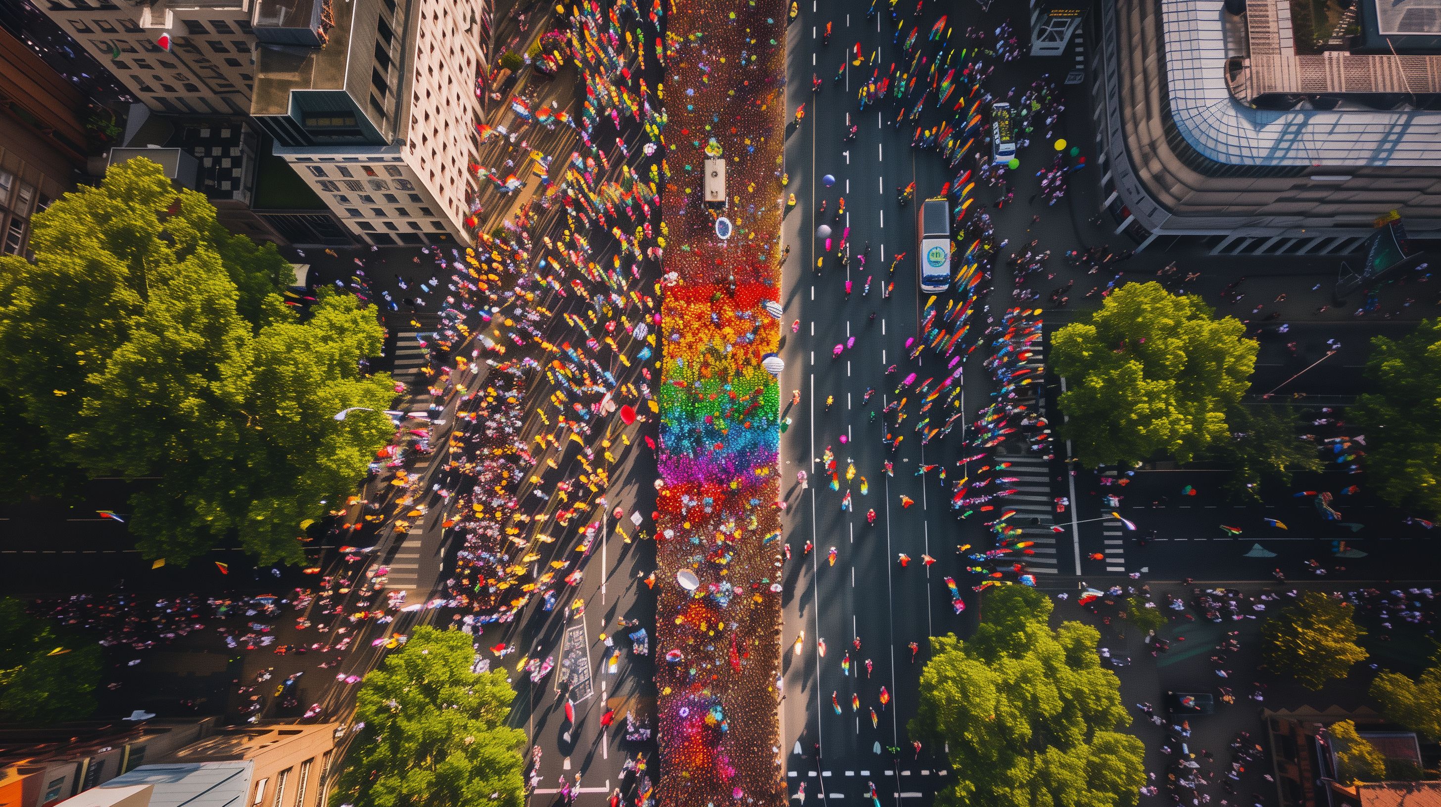 Die atemberaubende Luftaufnahme zeigt die farbenfrohe Atmosphäre einer Pride-Parade in einer pulsierenden Großstadt. Bunte Konfetti, Regenbogenfahnen und eine Menschenmenge, die ausgelassen feiert, verleihen der Szene eine einzigartige, festliche Stimmung. Die Perspektive von oben offenbart die beeindruckende Komposition aus Architektur, Straßen und grünen Bäumen, die von den Feierlichkeiten in ein leuchtendes Farbspektrum getaucht werden. Dieses hochauflösende Stockfoto eignet sich hervorragend für Blog-Beiträge, Newsletter-Designs, Social-Media-Postings oder Werbematerial rund um den CSD, LGBTQ-Themen und den Ausdruck von Freiheit, Stolz und Feierlust.