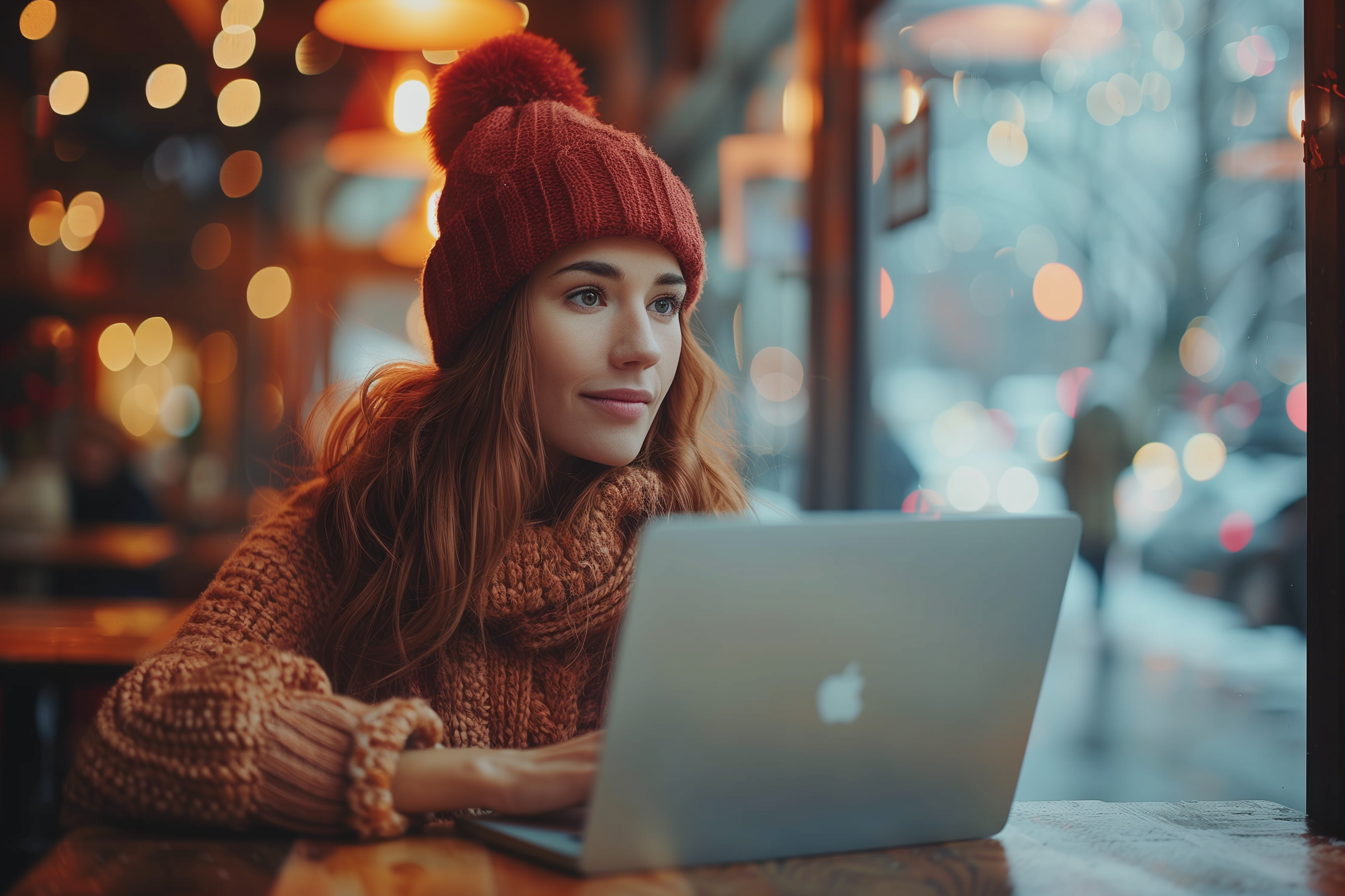 Das Foto zeigt eine junge Frau, die an einem Laptop arbeitet, während sie in einer verschneiten Winterlandschaft sitzt. Der Hintergrund ist unscharf, aber man kann die festlichen Lichter und Dekorationen der Stadt erkennen. Die Frau trägt einen braunen Schal und eine rote Mütze, was eine gemütliche und winterliche Stimmung vermittelt. Das Bild vermittelt den Eindruck von Kreativität, Produktivität und digitalem Nomadentum. Es eignet sich hervorragend für Blogs, Social-Media-Posts, Newsletter oder Werbematerialien rund um Themen wie Winterstimmung, Remote-Arbeit, Freelancing oder die Feiertage. Dieses hochauflösende Stockfoto ist kostenfrei unter einer Creative-Commons-Lizenz verfügbar.