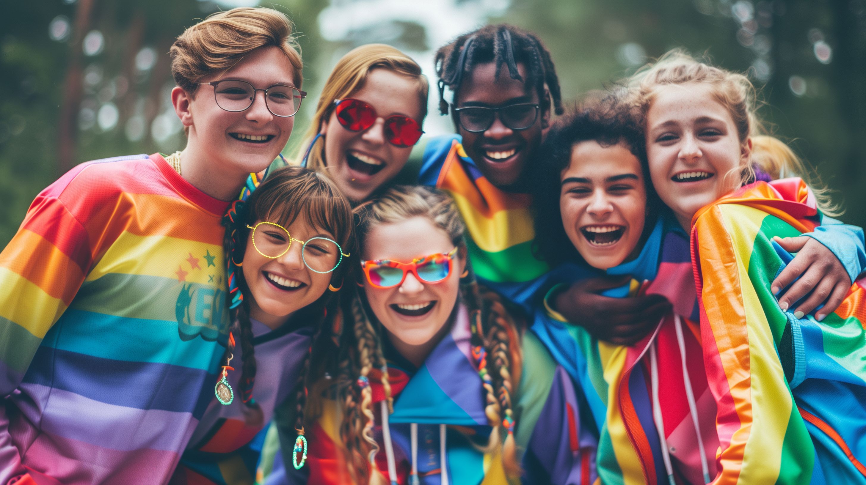 Das Foto zeigt eine Gruppe von sechs jungen, fröhlich lachenden Menschen, die in bunte Regenbogenoutfits gekleidet sind. Sie stehen eng zusammen und umarmen sich, was den Eindruck einer engen Freundschaft und Zusammengehörigkeit vermittelt. Die Kleidung, Sonnenbrillen und Accessoires in den Regenbogenfarben sowie die fröhlichen Gesichtsausdrücke der Abgebildeten verleihen dem Bild eine lebendige, lebensfrohe und offene Stimmung. Das Foto eignet sich hervorragend als kostenloses, hochauflösendes Stockfoto für Werbung, Social-Media-Beiträge oder Blogbeiträge rund um Themen wie Diversity, LGBTQIA+ oder Lebenslust. Es steht unter der Creative-Commons-Lizenz zur Verfügung.