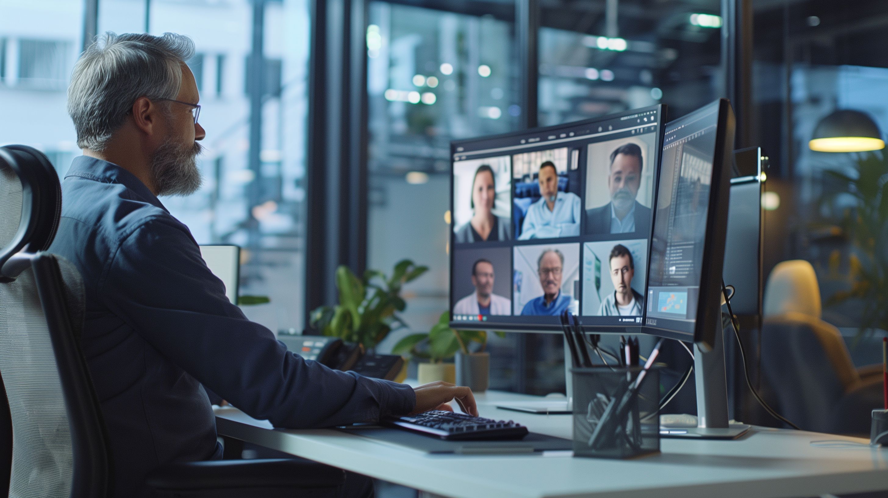 Das Bild zeigt einen Mann, der an einem Computer in einem modernen Büroumfeld sitzt und an einer Videokonferenz teilnimmt. Mehrere Bildschirme sind sichtbar, die verschiedene Teilnehmer der Videokonferenz in Fensterkacheln zeigen. Das Büroumfeld ist hell und freundlich gestaltet, mit Pflanzen und Beleuchtung, die eine professionelle und produktive Atmosphäre schaffen. Das Bild vermittelt den Eindruck einer digitalen Zusammenarbeit von Geschäftsleuten und könnte für Blogbeiträge, Newsletter, Social-Media-Posts oder Werbematerialien rund um Themen wie Teamarbeit, Kommunikation und Führung verwendet werden. Dieses kostenlose Stockfoto mit hoher Auflösung steht unter einer Creative-Commons-Lizenz zur Verfügung.