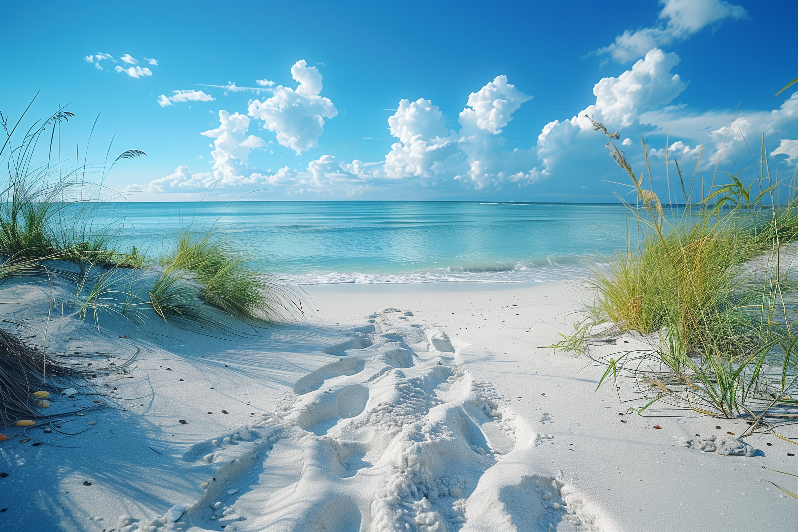 Das Bild zeigt einen idyllischen Strandabschnitt mit wunderschönen, weißen Sandstränden, sanften Dünen und üppigem Strandhafer. Der klare, azurblaue Himmel ist mit weißen, fluffigen Wolken durchzogen und spiegelt sich in dem ruhigen, türkisfarbenen Meer wider. Die friedliche Szenerie vermittelt ein Gefühl von Entspannung und Urlaubsstimmung. Dieses Foto wäre perfekt für den Einsatz in Blogs, Newsletters, Social-Media-Kanälen oder Werbematerialien, die eine natürliche, tropische Atmosphäre transportieren möchten. Als kostenloses Stockfoto in hoher Auflösung und unter einer Creative-Commons-Lizenz verfügbar, ist es vielseitig einsetzbar.