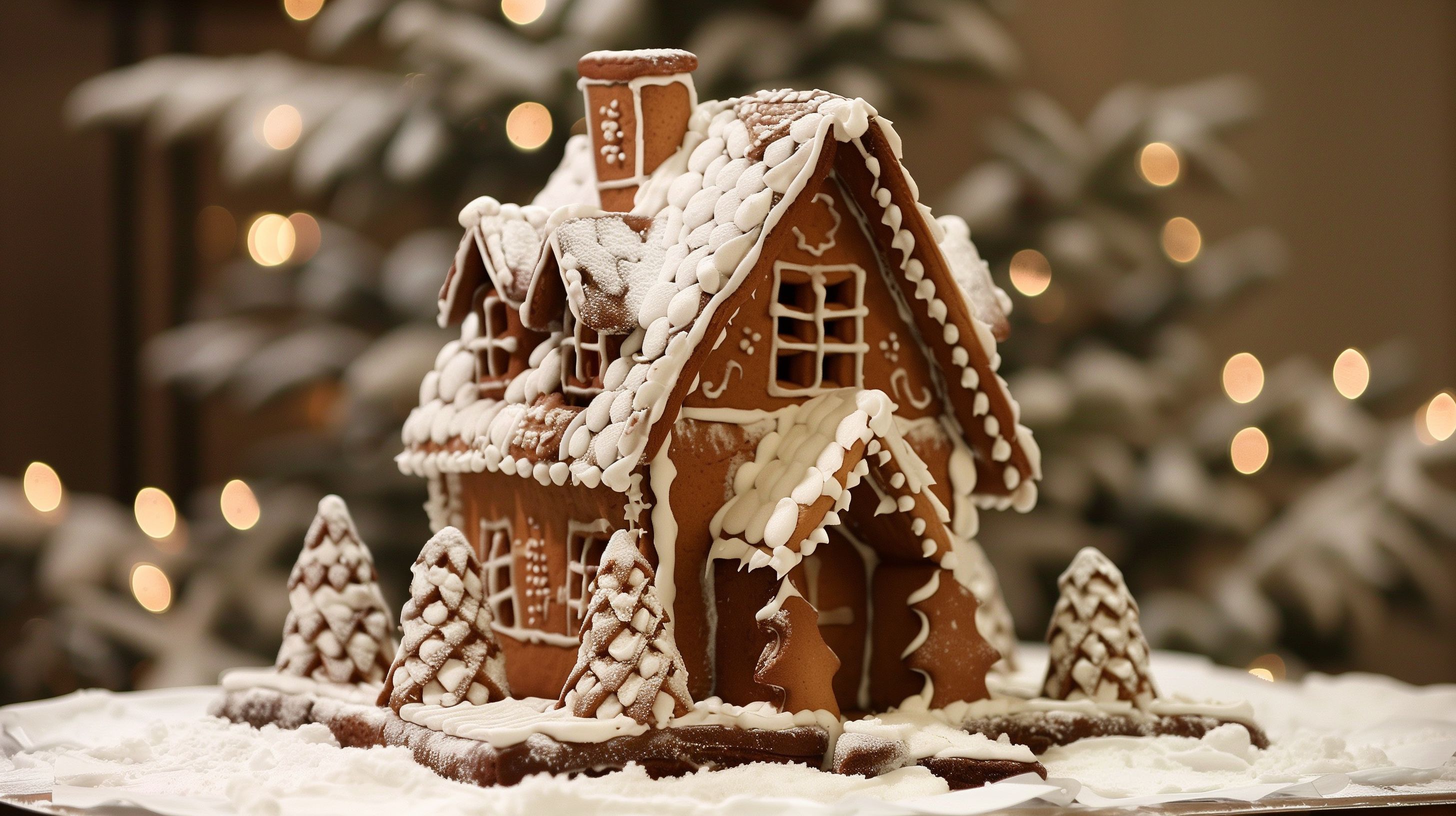 Das Foto zeigt ein detailliert verziertes Lebkuchenhaus, eingebettet in eine winterliche Landschaft mit verschneiten Tannen. Das Haus ist mit feinen Verzierungen und Zuckerguss überzogen, was ihm ein märchenhaftes Aussehen verleiht. Die verschneite Umgebung sowie die funkelnden Lichter im Hintergrund erzeugen eine besinnliche, festliche Stimmung. Dieses hochauflösende Stockfoto eignet sich hervorragend für Weihnachts- und Winterkampagnen in Blogs, Newslettern oder Sozialen Medien. Es ist unter einer Creative-Commons-Lizenz frei nutzbar.
