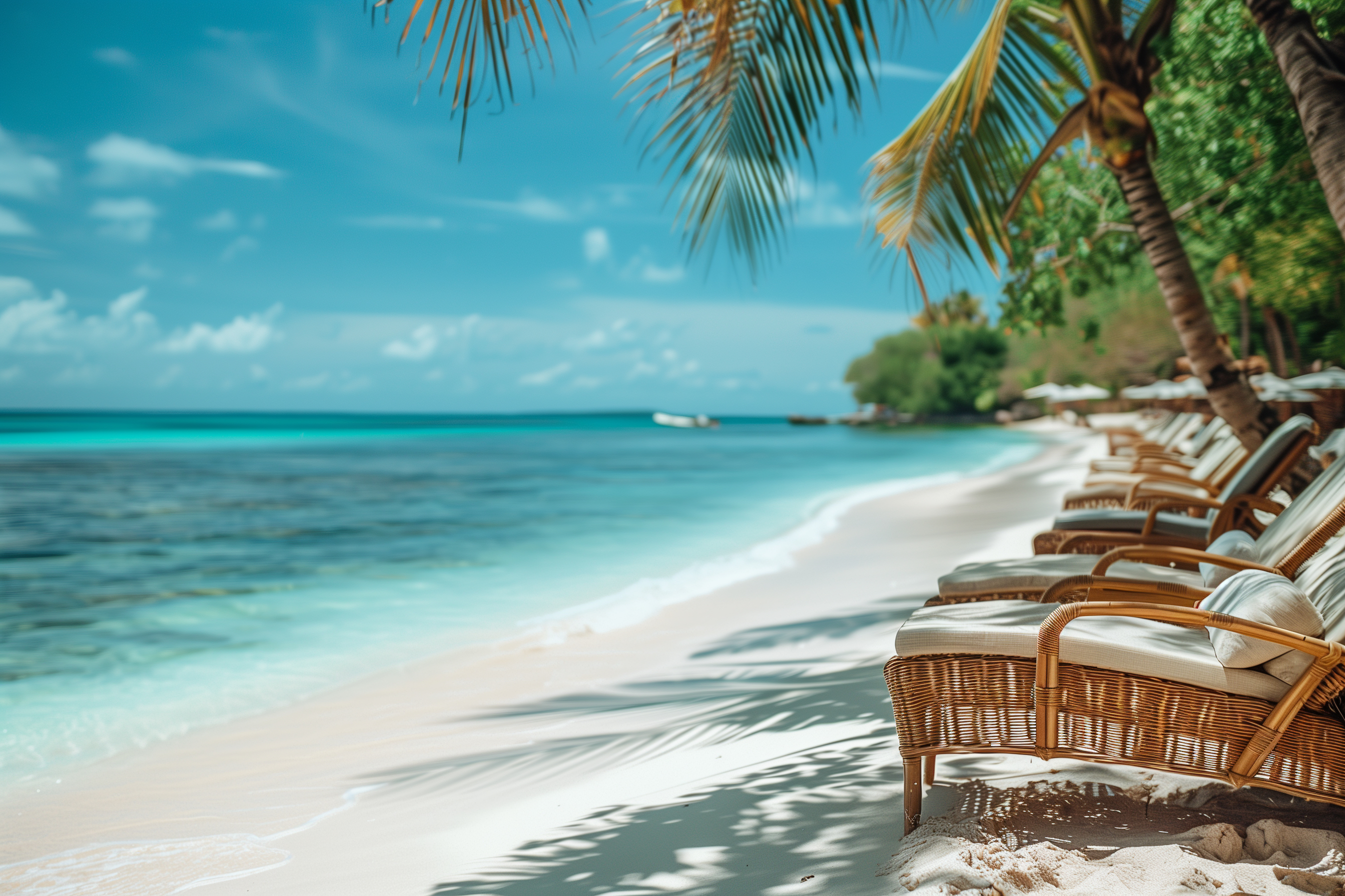Das Foto zeigt eine idyllische Strandszene in den Tropen. Im Vordergrund sind reihenweise bequeme Liegestühle unter Palmen aufgestellt, die den Blick auf das türkisfarbene Wasser und den blauen Himmel mit Wolken freigeben. Der Sandstrand erstreckt sich in sanfter Kurve bis zum Ufer des Meeres. Die Szenerie vermittelt eine pure, entspannende Urlaubsatmosphäre und lädt dazu ein, sich in diesem Paradies zu erholen.