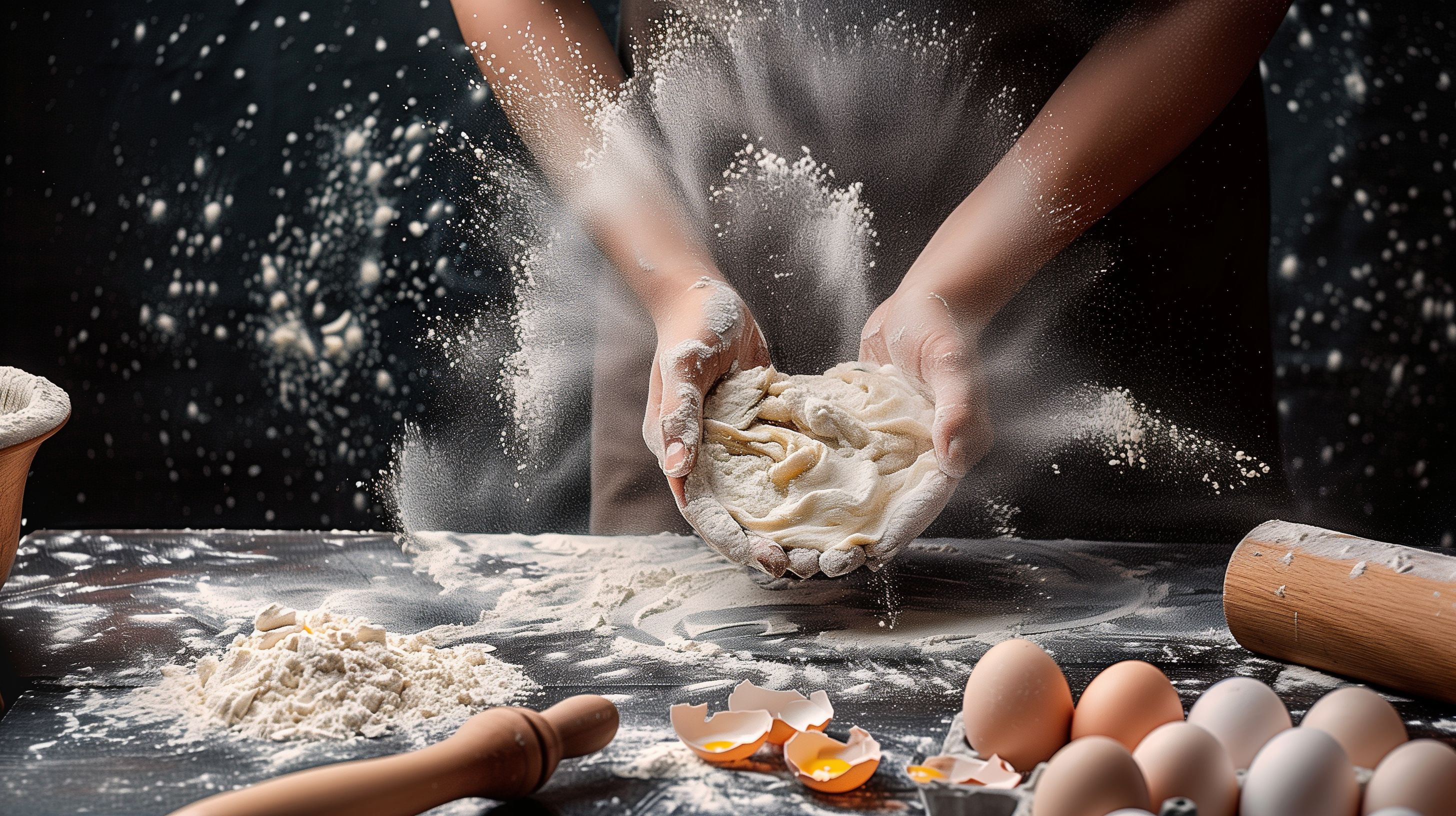 Das Bild zeigt eine Nahaufnahme von Händen, die einen Teig kneten. Dabei entsteht eine Mehlexplosion, die die Szene in ein stimmungsvolles Licht taucht. Die Hände sind in den Teig eingetaucht und wirbeln das Mehl auf, sodass es in der Luft verteilt wird. Der Fokus liegt auf den Händen und dem Mehl, während der Hintergrund dunkel und kontrastreich gehalten ist, um die Aktion in den Mittelpunkt zu rücken.