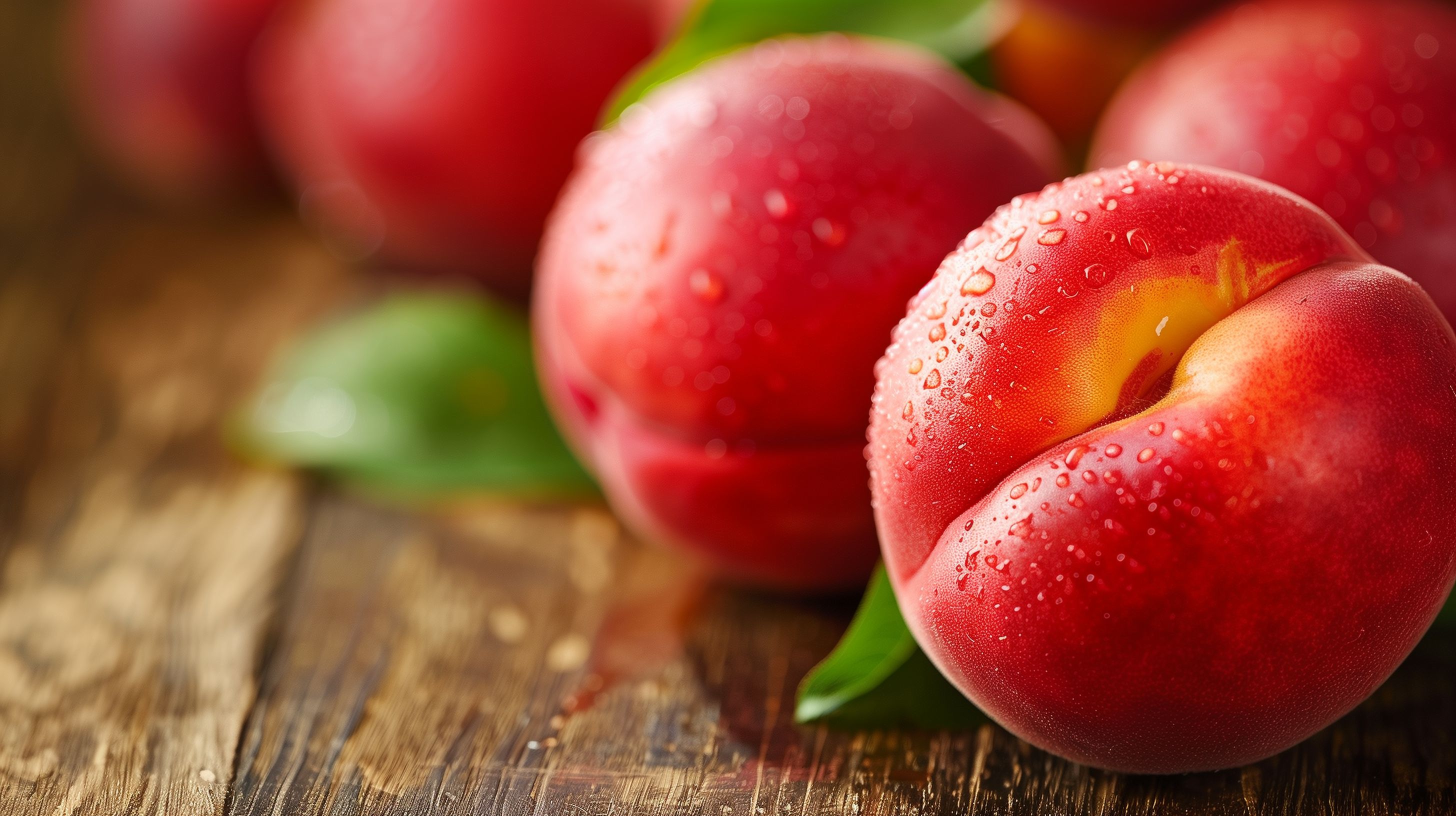Das Bild zeigt einige reife, saftige Pfirsiche, die auf einem rustikalen Holztisch liegen. Die Pfirsiche haben eine schöne, rötliche Farbe und sind mit glitzernden Wassertropfen überzogen, was ihnen einen natürlichen, frischen Ausdruck verleiht. Die Komposition fokussiert sich auf die Früchte und lässt den Hintergrund unscharf, was den Blick auf die Hauptmotive lenkt. Dieses Stockfoto in hoher Auflösung eignet sich hervorragend für die Verwendung in Blogs, Newslettern, Social-Media-Kanälen oder Werbematerialien, bei denen es um gesunde, natürliche Lebensmittel geht. Es steht unter einer Creative-Commons-Lizenz zur freien Nutzung zur Verfügung.
