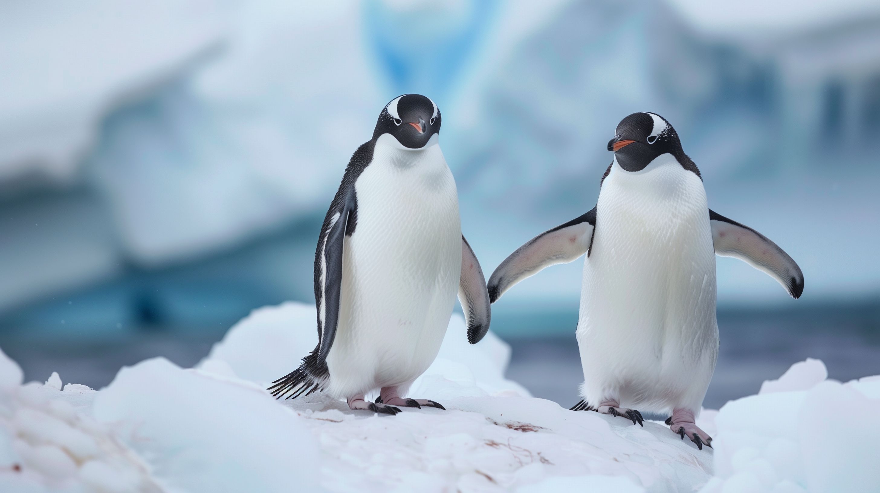Dieses Foto zeigt zwei Kaiserpinguine, die auf einem Eisfeld in der Antarktis stehen. Die beiden Vögel haben schwarze Rücken und weiße Bäuche. Sie wirken majestätisch und anmutig inmitten der eisigen Umgebung mit Gletschern im Hintergrund. Die Aufnahme besticht durch ihre klaren Farben, die die Schönheit und Ruhe der Antarktis widerspiegeln. Dieses kostenlose Stockfoto in hoher Auflösung eignet sich hervorragend für Blogs, Newsletter, Social-Media-Beiträge oder Werbeaktionen rund um Natur, Umweltschutz und Tierwelt. Die Nutzung ist dank der Creative-Commons-Lizenz einfach und unkompliziert.