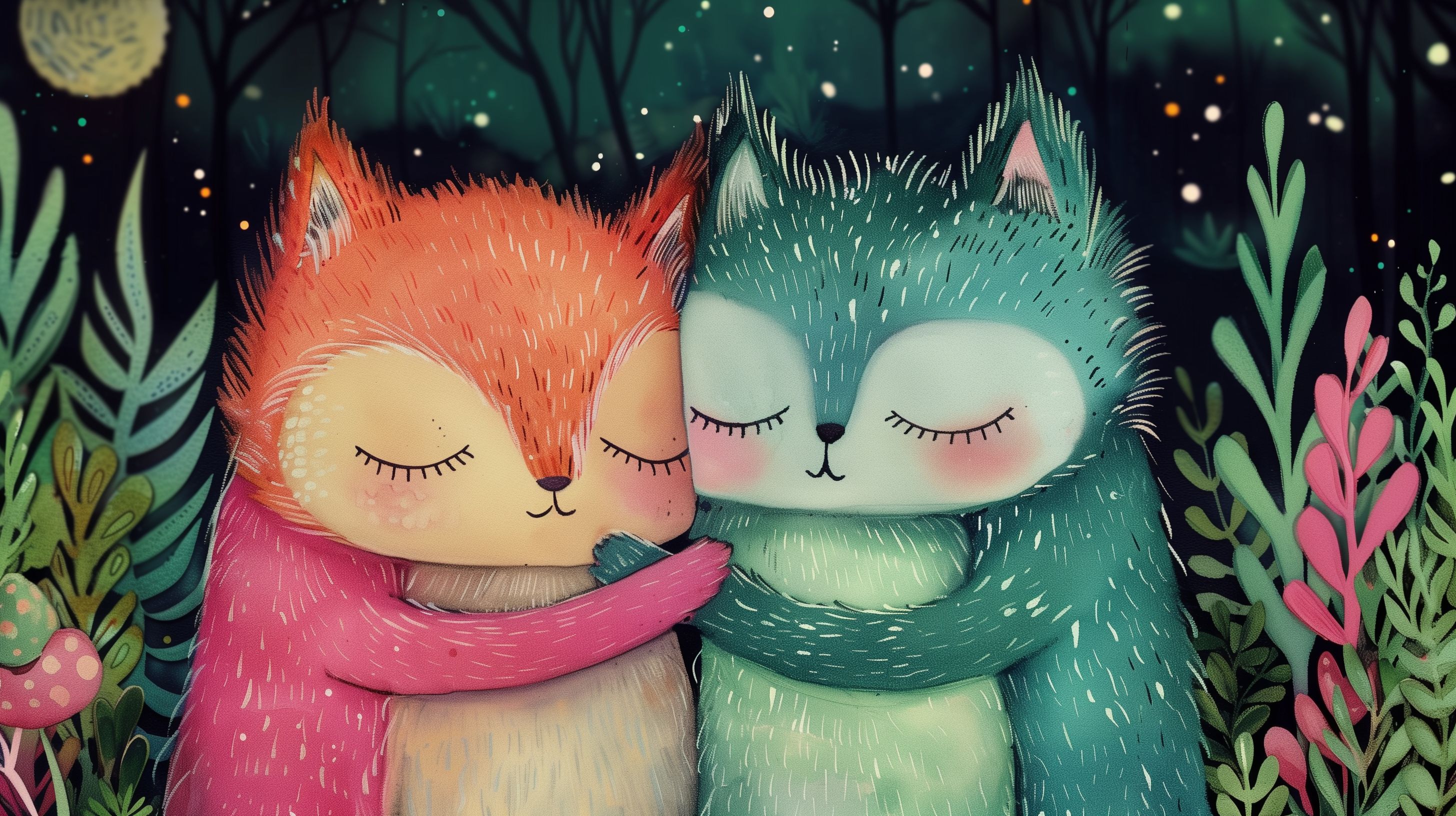 Dieses fantasievoll illustrierte Bild zeigt zwei kuschelnd schlafende Waldtiere, vermutlich Füchse oder Waschbären, in einer stimmungsvollen Nachtszene mit Mond und Sternen. Die Tiere liegen eng umschlungen in einem üppig bewachsenen Waldstück, umgeben von Blumen und Pflanzen. Die zarten, pastelligen Farben sowie die schlafende Pose der Tiere erzeugen eine besonders gemütliche und entspannte Atmosphäre. Dieses Stockfoto eignet sich ideal für den Einsatz in Blogs, Newslettern, Social-Media-Beiträgen oder auch Werbematerialien mit Themen wie Natur, Freundschaft, Ruhe oder Entspannung. Das hochauflösende Bild steht unter einer Creative-Commons-Lizenz zur kostenlosen Verwendung zur Verfügung.