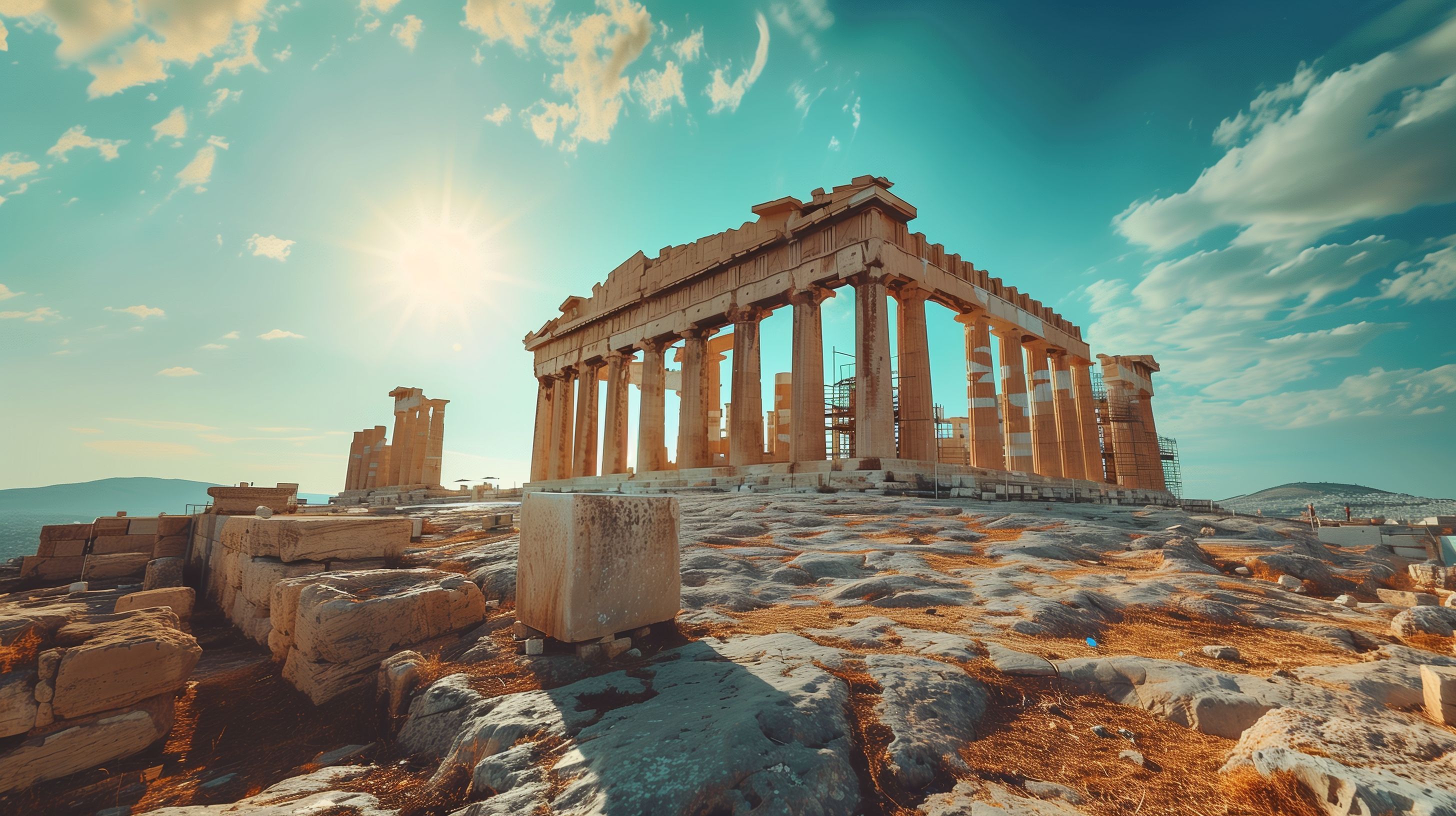 Das Foto zeigt die beeindruckende Akropolis von Athen, eines der berühmtesten antiken Bauwerke Griechenlands. Die mächtigen Säulen und Tempel der Akropolis ragen majestätisch unter einem strahlend blauen Himmel empor, umgeben von der rauen Berglandschaft. Die Anmut und Schönheit dieser historischen Stätte wird durch das warme Sonnenlicht und die dramatischen Wolkenformationen unterstrichen. Dieses Bild ist ideal für die Verwendung in Reiseberichten, Blogbeiträgen über Griechenland oder Werbematerialien für Kulturreisen. Als hochauflösendes, kostenloses Stockfoto unter Creative-Commons-Lizenz eignet es sich hervorragend für eine Vielzahl von Anwendungen in Printmedien, auf Websites oder in sozialen Medien.