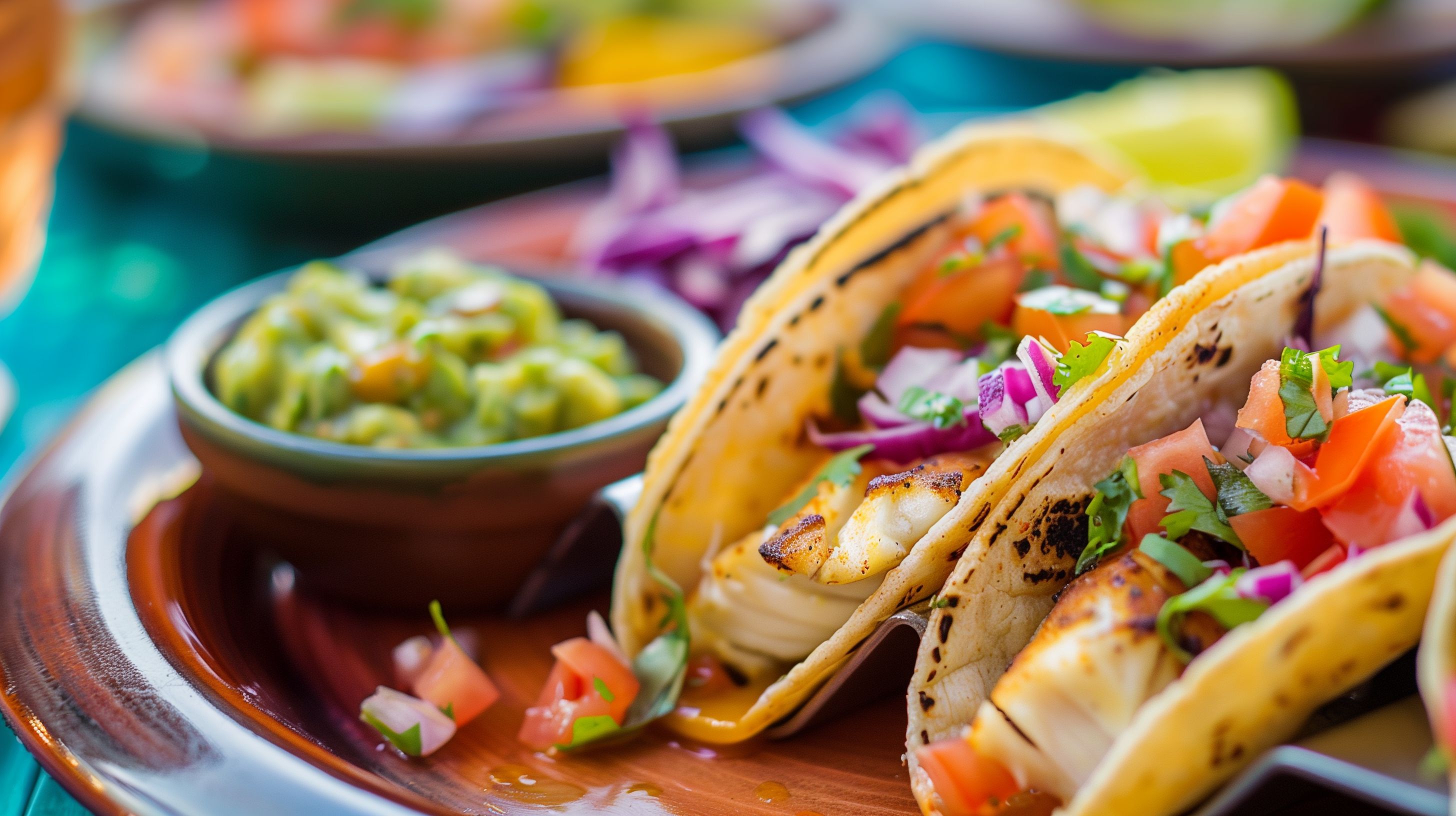 Dieses Foto zeigt eine köstliche Auswahl an frischen mexikanischen Tacos. Die Tacos sind mit gegrilltem Fisch, Tomaten, Zwiebeln, Koriander und einer cremigen Guacamole gefüllt. Die Zutaten sind auf einem rustikalen Teller angerichtet, der die authentische mexikanische Atmosphäre unterstreicht. Die Farbkontraste von Grün, Rot und Gelb machen das Gericht optisch sehr ansprechend. Dieses Stockfoto eignet sich hervorragend für die Verwendung in Blogs, Newslettern, Social-Media-Beiträgen oder Werbematerialien rund um mexikanische Küche, gesunde Ernährung oder leckere Mahlzeiten. Das Foto ist in hoher Auflösung verfügbar und unter einer Creative-Commons-Lizenz kostenlos nutzbar.