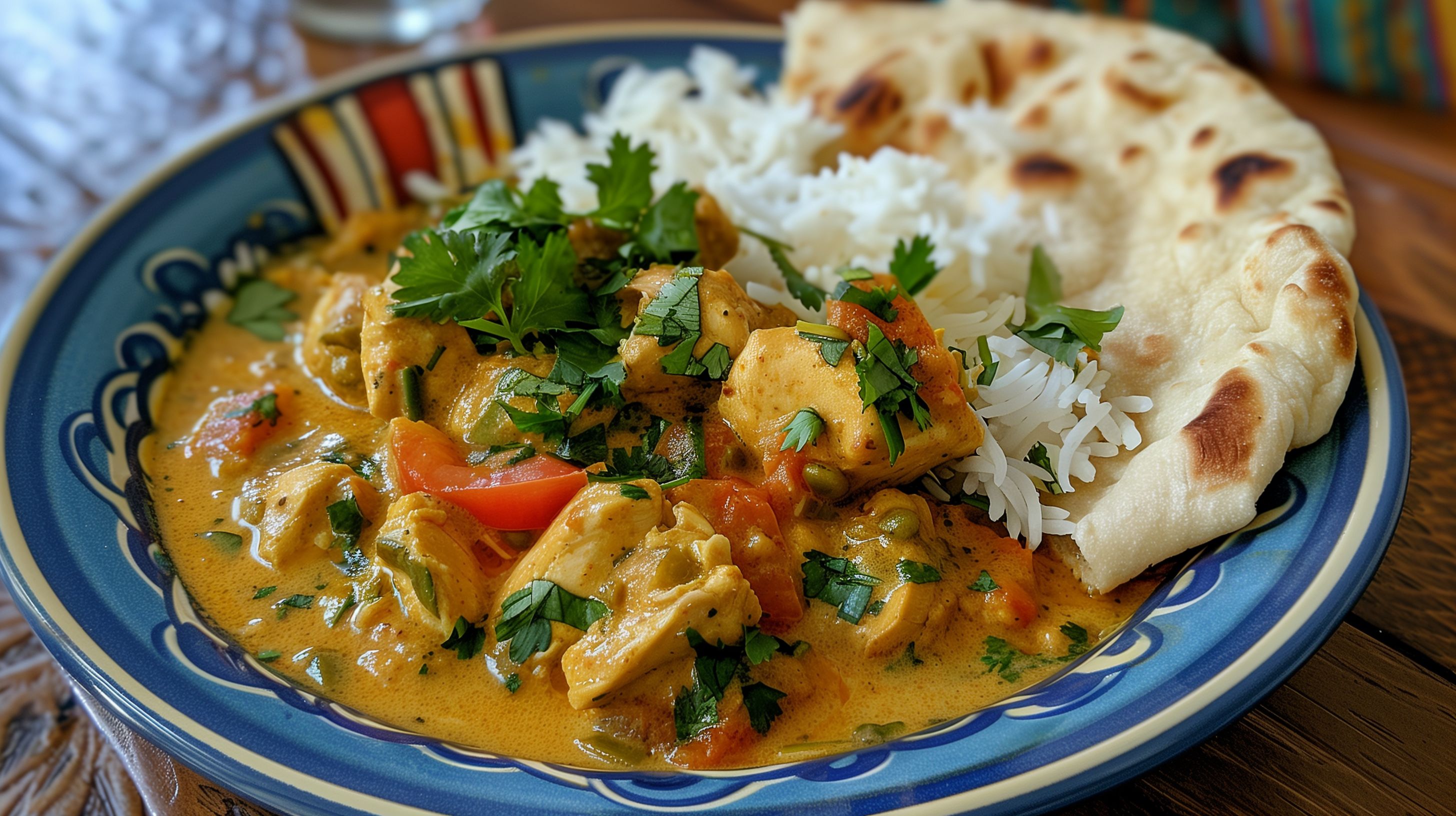 Das Bild zeigt ein appetitliches, würziges Hühnchen-Curry, serviert auf einem bunt bemalten, rustikalen Teller. Neben dem Curry sind Basmatireis und ein knuspriges Naan-Brot zu sehen, was die typisch indische Kombination vervollständigt. Die Zutaten sind in einem harmonischen Farbspiel aus Gelb, Orange und Grün angerichtet, was dem Gericht eine lebendige und einladende Optik verleiht. Das Foto eignet sich hervorragend als kostenloses Stockfoto für Blogs, Newsletter oder Social-Media-Beiträge rund um die Themen Kochen, Ernährung oder internationale Küche. Die hohe Auflösung und Creative-Commons-Lizenz erlauben eine vielseitige Nutzung.
