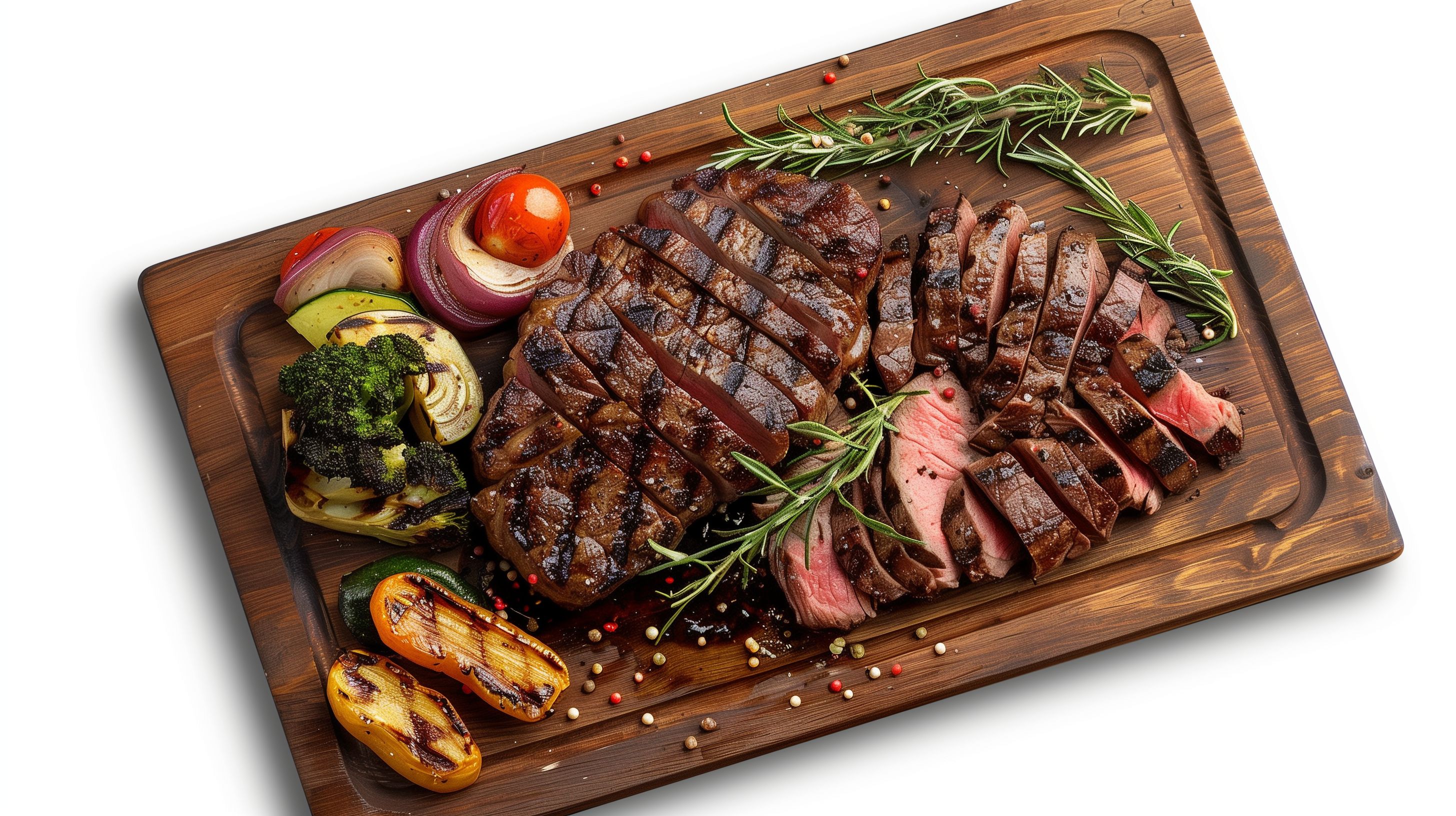 Das Bild zeigt ein perfekt gegrillt aussehendes Steak, das auf einem rustikalen Holzbrett angerichtet ist. Neben dem Steak sind gegrilltes Gemüse wie Brokkoli, Zwiebeln und Tomaten sowie ein Rosmarinzweig und einige Pfefferkörner zu sehen. Die Anordnung wirkt sehr appetitlich und hochwertig, wobei die natürlichen Farben und die hölzerne Optik des Brettes für einen authentischen und kulinarischen Eindruck sorgen. Dieses Stockfoto in hoher Auflösung eignet sich hervorragend für den Einsatz in Blogbeiträgen, Newslettern oder Social-Media-Kanälen zum Thema Kochen, Grillrezepte oder Lebensmittelfotografie. Es steht unter der Creative-Commons-Lizenz zur freien Verwendung zur Verfügung.