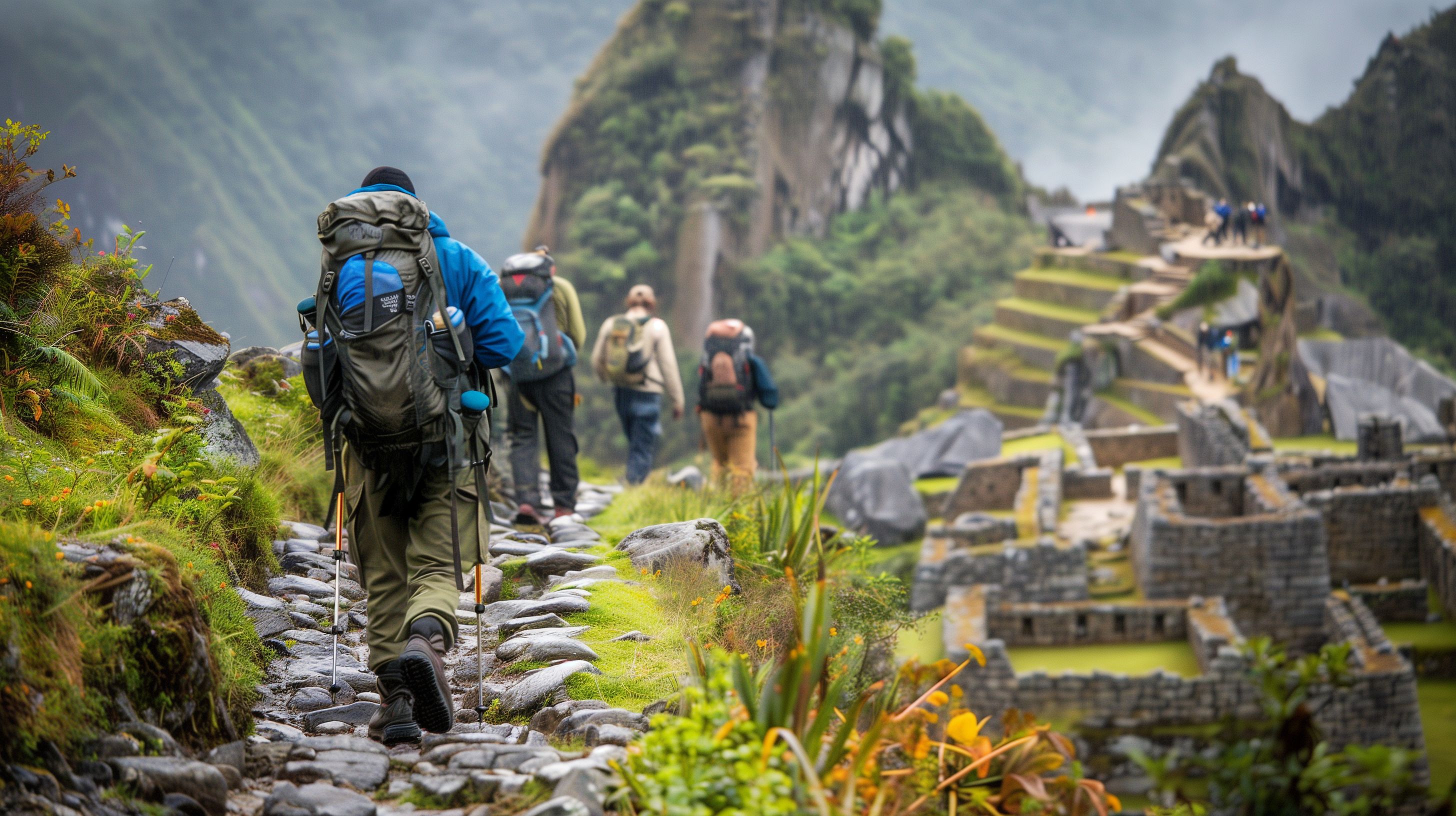 Dieses eindrucksvolle Foto zeigt eine Gruppe von Wanderern auf dem legendären Inka-Trail nach Machu Picchu in Peru. Der Weg führt durch eine beeindruckende Berglandschaft mit massiven Felsformationen, üppiger Vegetation und steilen Treppenstufen. Die Wanderer mit ihren großen Rucksäcken sind auf einem Abschnitt des Pfades zu sehen, der sich durch die grüne Umgebung schlängelt. Im Hintergrund ragen die charakteristischen Gipfel von Machu Picchu auf, der weltberühmten Inka-Ruinenstadt.