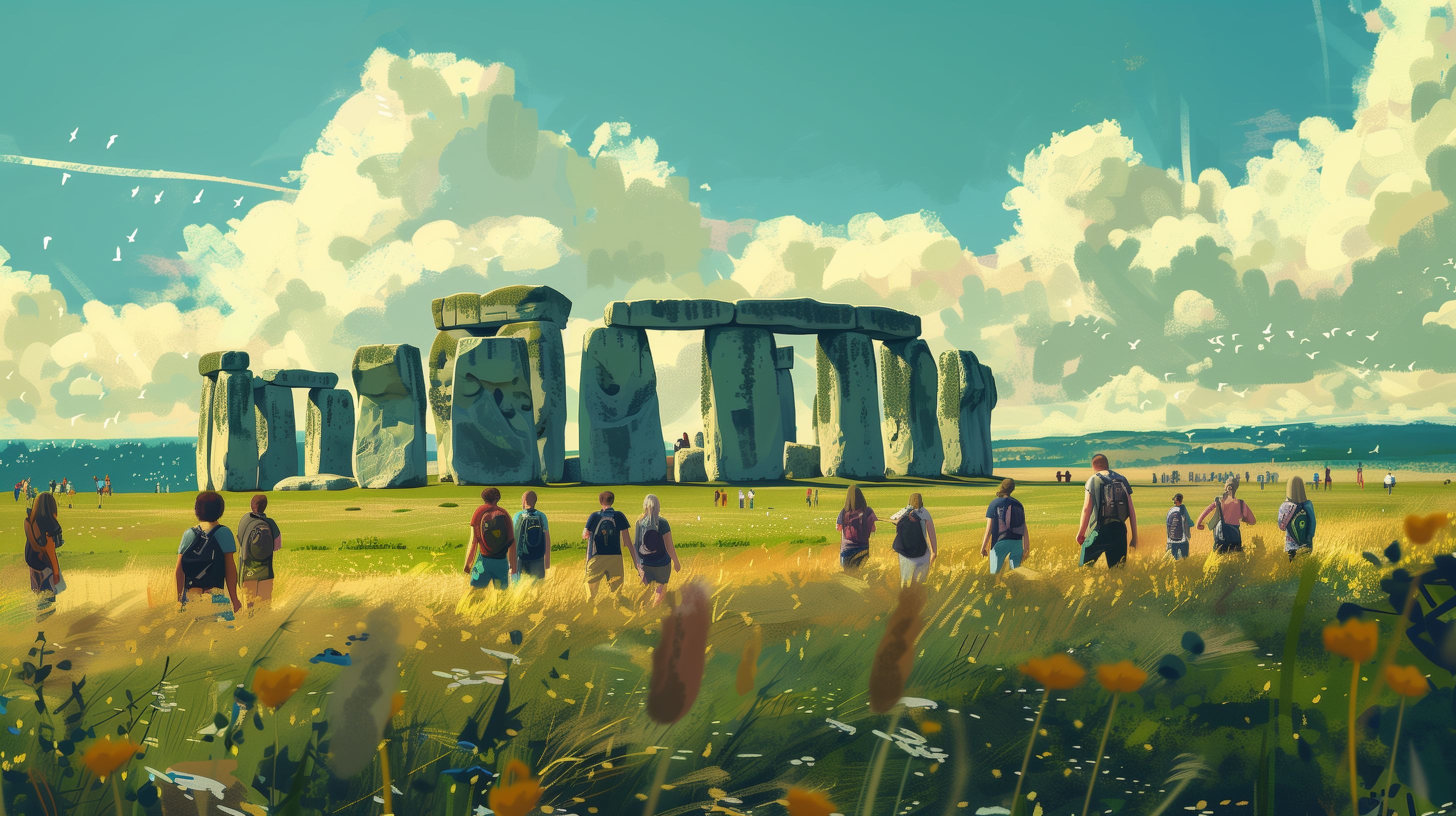 Dieses lebendige Bild zeigt eine Gruppe von Wanderern, die die beeindruckenden Ruinen von Stonehenge in einer wunderschönen, ländlichen Landschaft erkunden. Der weite Himmel ist mit flauschigen, weißen Wolken bedeckt, die sich im Kontrast zu dem satten Grün der Wiese und den monumentalen Steinblöcken abzeichnen. Die Wanderer wirken, als würden sie die Atmosphäre und Mystik dieses historischen Ortes in vollen Zügen genießen. Dieses stimmungsvolle Foto eignet sich hervorragend für die Verwendung in Blogs, Reiseportalen, Newslettern oder Social-Media-Beiträgen zum Thema Natur, Reisen und Kultur. Als kostenloses Stockfoto in hoher Auflösung und unter Creative-Commons-Lizenz ist es frei für den persönlichen und kommerziellen Gebrauch.
