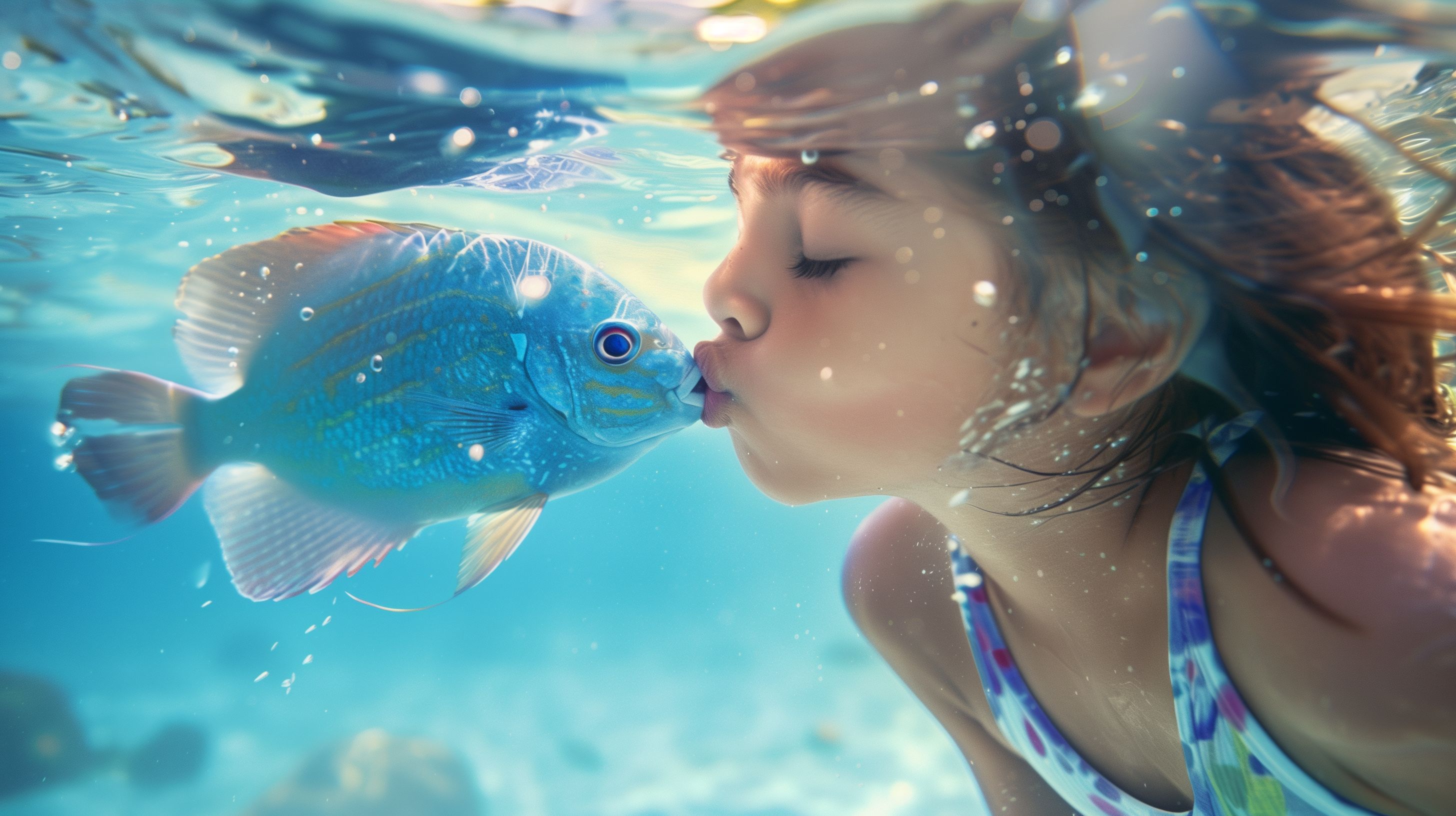 Das Foto zeigt ein junges Mädchen, das im türkisblauen Wasser unter der Wasseroberfläche einen farbenfrohen Fisch küsst. Die Perspektive ist aus Unterwassersicht gewählt, sodass das Mädchen von unten fotografiert wurde. Die Szene hat einen märchenhaften und fantastischen Charakter, der durch die leuchtenden Farben und die Unschärfe des Hintergrunds verstärkt wird. Das Bild eignet sich hervorragend als hochwertiges Stockfoto für Beiträge in Blogs, Newslettern, Werbematerialien oder Social-Media-Kanälen, in denen eine natürliche, aquatische und romantische Stimmung vermittelt werden soll. Dieses Creative-Commons-Lizenzierte Foto ist in hoher Auflösung verfügbar und kann kostenfrei für verschiedene Zwecke genutzt werden.