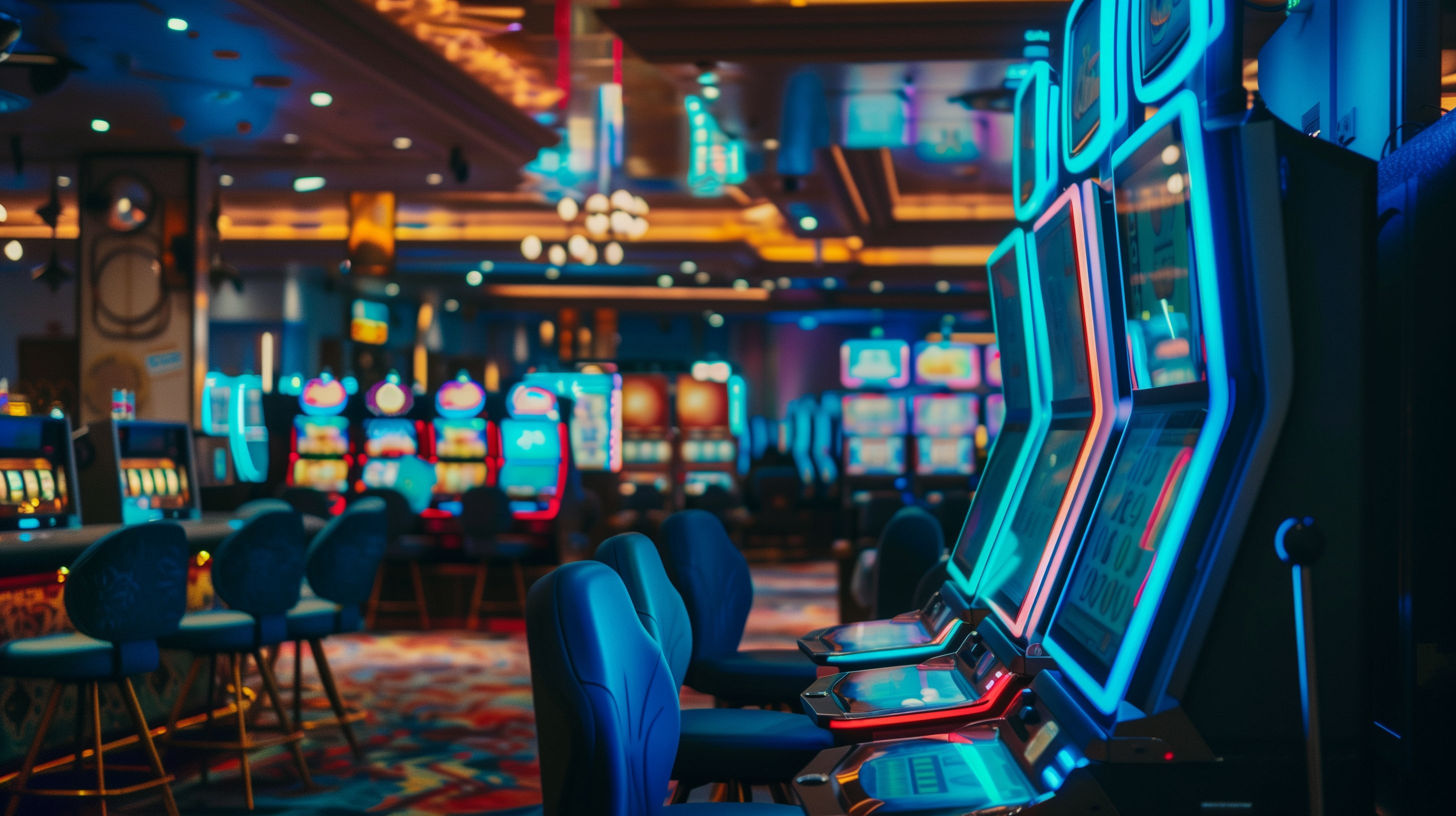 Das Bild zeigt eine bunte und lebendige Kasino-Spielhalle, die durch Neonlichter in verschiedenen Farben erleuchtet ist. Im Vordergrund sieht man mehrere Spielautomaten, die zum Spielen einladen. Der Raum ist mit einem luxuriösen Interieur ausgestattet, bestehend aus gemütlichen Sitzgelegenheiten und eleganten Dekorationen. Die Stimmung ist aufregend und einladend, was dieses Stockfoto ideal für den Einsatz in Blogs, Newslettern, Social-Media-Kanälen oder Werbekampagnen zum Thema Glücksspiel, Freizeit und Unterhaltung macht. Dieses hochauflösende, kostenlose Foto unter Creative-Commons-Lizenz vermittelt eine lebendige und atmosphärische Kasino-Stimmung.