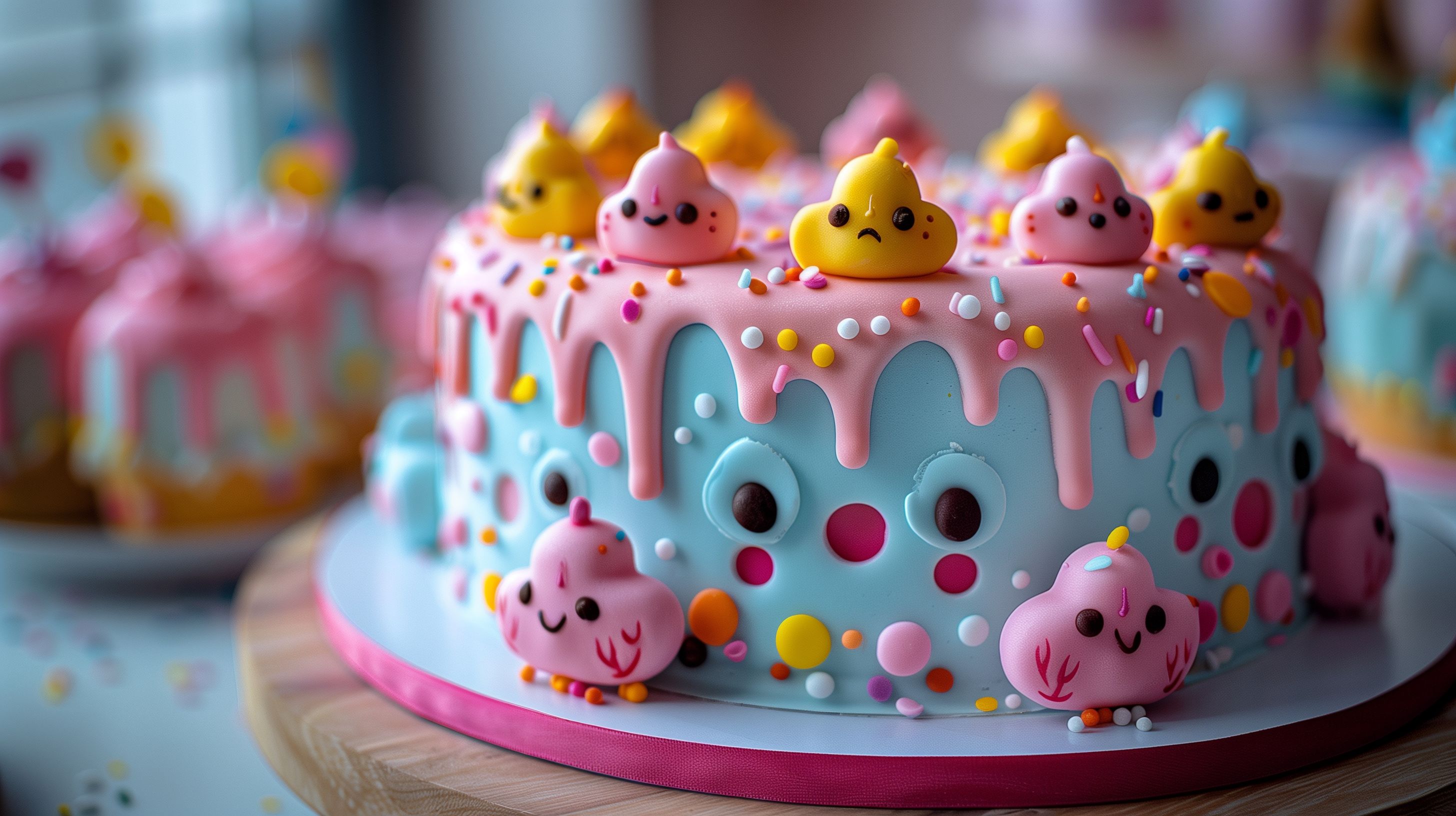 Dieses farbenfrohe Foto zeigt einen kunstvoll gestalteten Geburtstagskuchen mit einer Vielzahl von süßen Gesichtern und lebendigen Texturen. Der Kuchen ist in pastelligen Farbtönen wie Blau, Rosa und Gelb gehalten und mit Sprenkeln, Tropfen und Perlen dekoriert, die dem Ganzen einen spielerischen, kindlichen Charakter verleihen. Darauf befinden sich kleine Figuren mit lachendem Gesichtsausdruck, die den Kuchen noch zusätzlich verzieren. Dieses Foto wäre ideal für die Verwendung in Blogs, Newslettern oder Werbematerialien rund um Geburtstage, Partys und Backwaren. Als hochauflösendes, kostenloses Stockfoto unter Creative-Commons-Lizenz kann es vielseitig eingesetzt werden.
