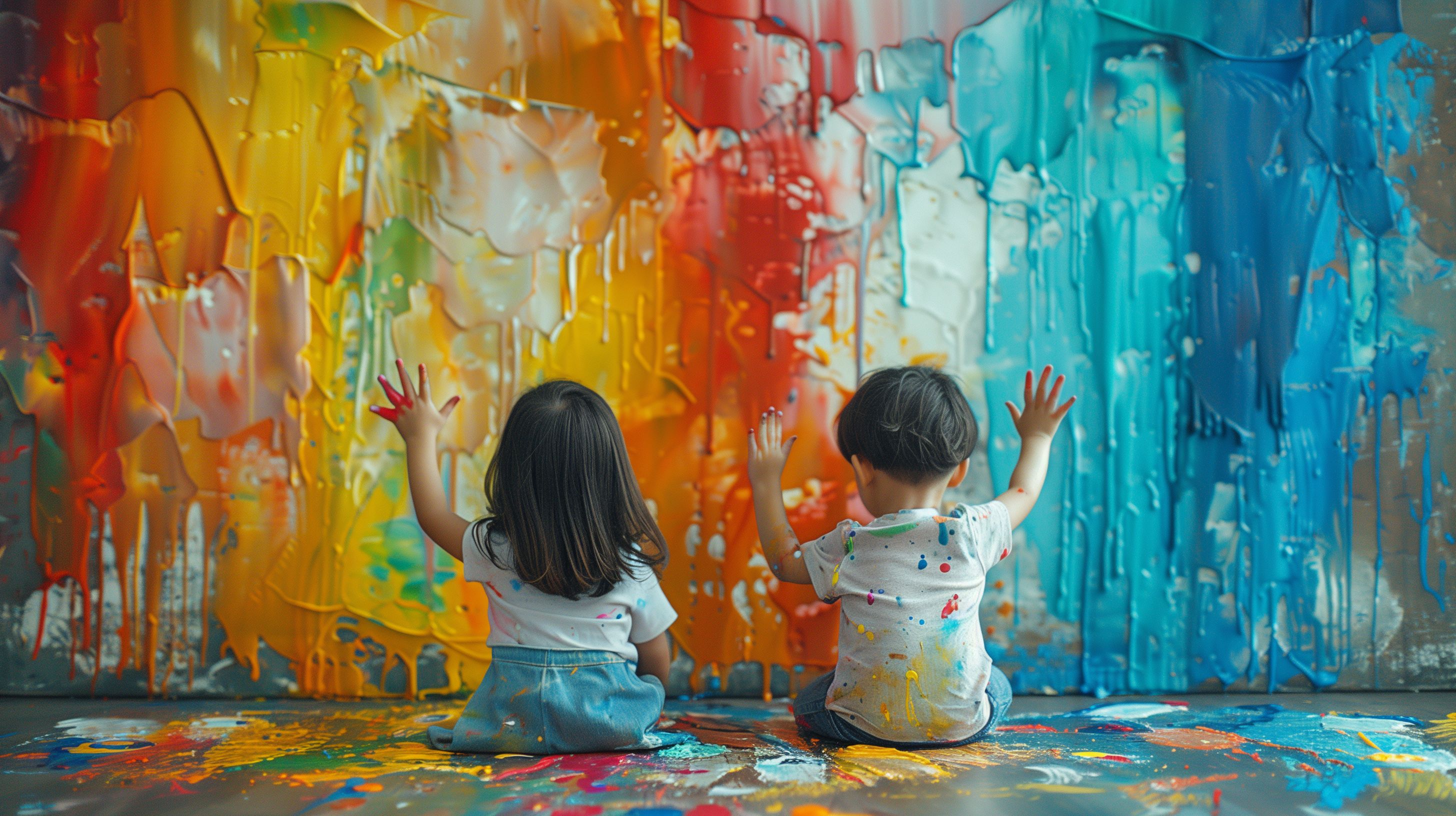 Das Foto zeigt zwei Kinder, die mit bunten Farben eine große Leinwand gestalten. Sie sitzen auf dem Boden und haben ihre Hände ausgestreckt, um die farbenfrohen Pinselstriche auf der Leinwand zu hinterlassen. Die Leinwand ist mit einer Vielzahl an Farben überzogen - von leuchtendem Orange und Gelb bis hin zu sanftem Blau und Türkis. Die Kinder scheinen vollkommen in ihre Kreativität versunken zu sein und den Entstehungsprozess des Kunstwerks zu genießen.