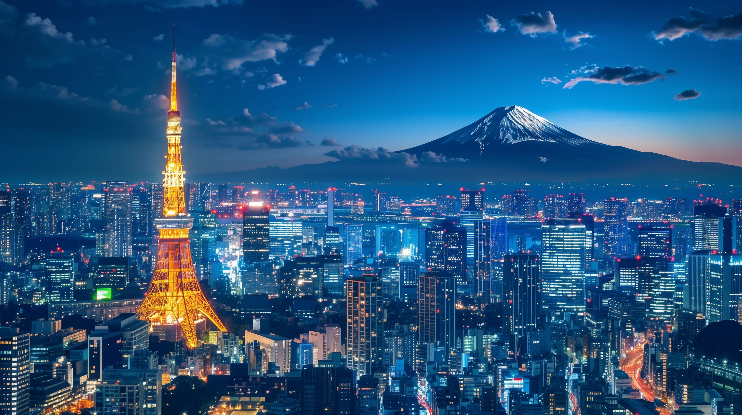 Dieses atemberaubende Foto zeigt die nächtliche Skyline von Tokio, der Hauptstadt Japans. Im Vordergrund dominiert der beleuchtete Tokyo Tower, der an den französischen Eiffelturm erinnert. Am Horizont erhebt sich majestätisch der schneebedeckte Gipfel des Mount Fuji, eines der bekanntesten Wahrzeichen Japans. Die Skyline ist eine Mischung aus modernen Wolkenkratzern, die in den Himmel ragen, und traditionellen japanischen Gebäuden. Das Bild strahlt eine faszinierende Mischung aus Tradition und Moderne aus und ist ideal für den Einsatz in Reiseberichten, Werbekampagnen oder auf Webseiten zum Thema Japan und Tokio.