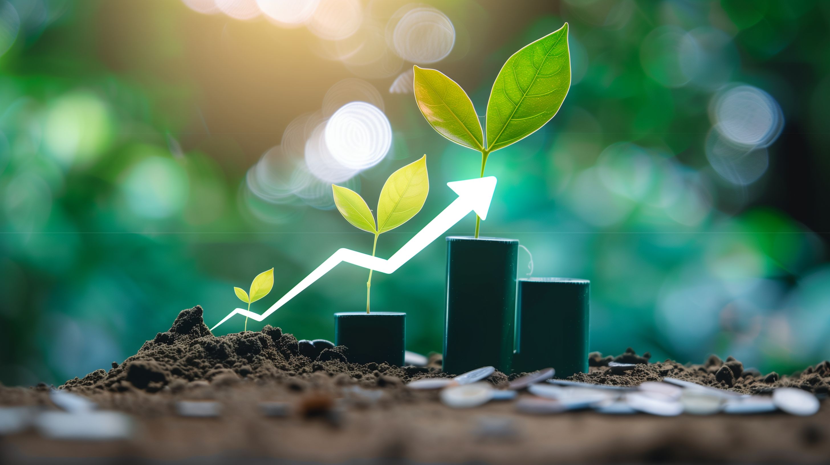 Das Bild zeigt eine symbolische Darstellung von nachhaltigem Wachstum und Investitionen. Auf einem Hügel aus Erde wachsen kleine Pflänzchen, deren Blätter wie Pfeile nach oben zeigen. Dieser Aufwärtstrend wird durch eine weiße Grafiklinie unterstützt, die aus dem Boden kommt und nach oben steigt. Die Szene ist in ein grünes, verschwommenes Umfeld eingebettet, was den Eindruck von Frische, Natur und Umweltfreundlichkeit vermittelt.