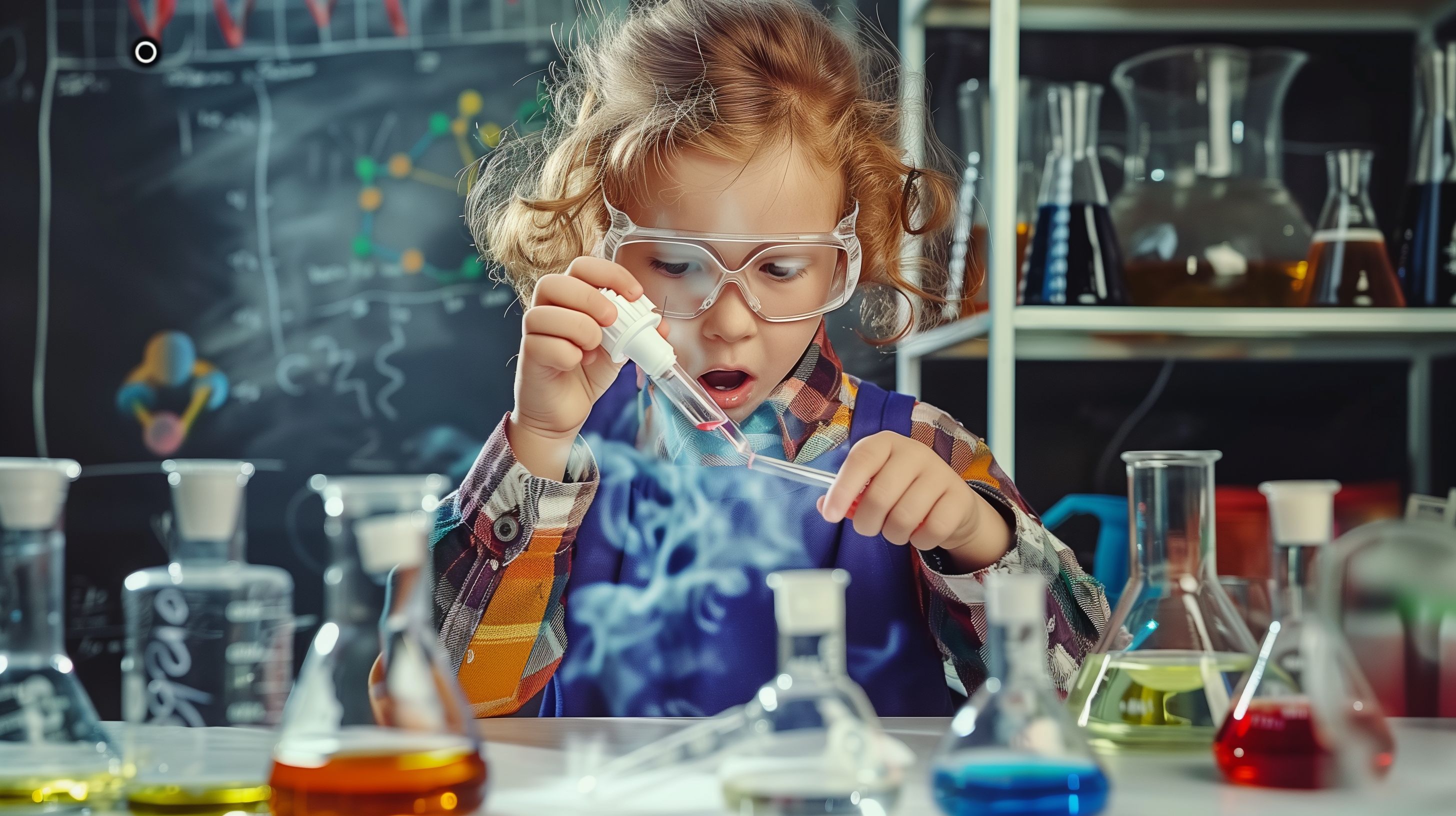 Das Bild zeigt ein junges Mädchen in einem Chemielabor, das fasziniert eine Flüssigkeit in einem Reagenzglas betrachtet. Sie trägt eine Schutzbrille und ist von bunten Chemikalien in Glasgefäßen umgeben. Die Szene vermittelt den Eindruck von kindlicher Neugier und Entdeckerfreude in einem wissenschaftlichen Umfeld. Das Foto eignet sich hervorragend als kostenloses Stockfoto für Beiträge rund um MINT-Förderung, Bildung und Wissenschaftsvermittlung für Kinder. Mit seiner hohen Auflösung und der kreativen Komposition ist es auch für den Einsatz in Werbung, Blogs oder Newslettern bestens geeignet und steht unter einer Creative-Commons-Lizenz zur Verfügung.