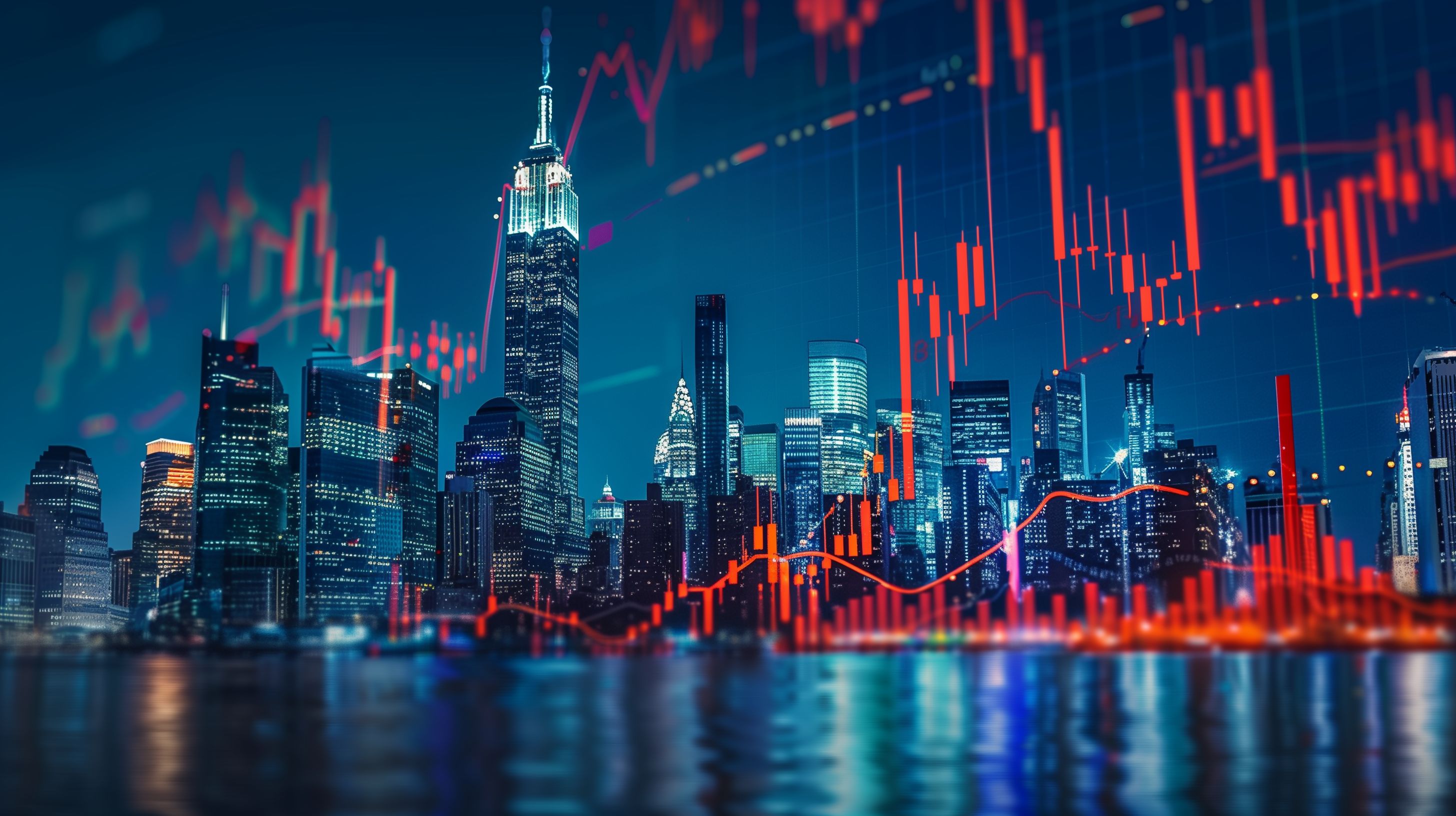 Dieses faszinierende Bild zeigt die beeindruckende Skyline von New York City, der Finanzmetropole der Welt, kombiniert mit einem dynamischen Finanzdiagramm. Die nächtliche Szene ist von bunten Neonfarben und Reflexionen auf dem Wasser geprägt, was eine spannende Stimmung erzeugt. Das Zusammenspiel zwischen Stadtarchitektur und Finanzsymbolik repräsentiert die Bedeutung von New York als globales Zentrum der Wirtschaft und Investitionen. Dieses hochauflösende, kostenlose Stockfoto eignet sich hervorragend für Unternehmens- und Finanzpublikationen, Blogbeiträge zu Wirtschaftsthemen oder Werbematerial für den Finanzsektor.