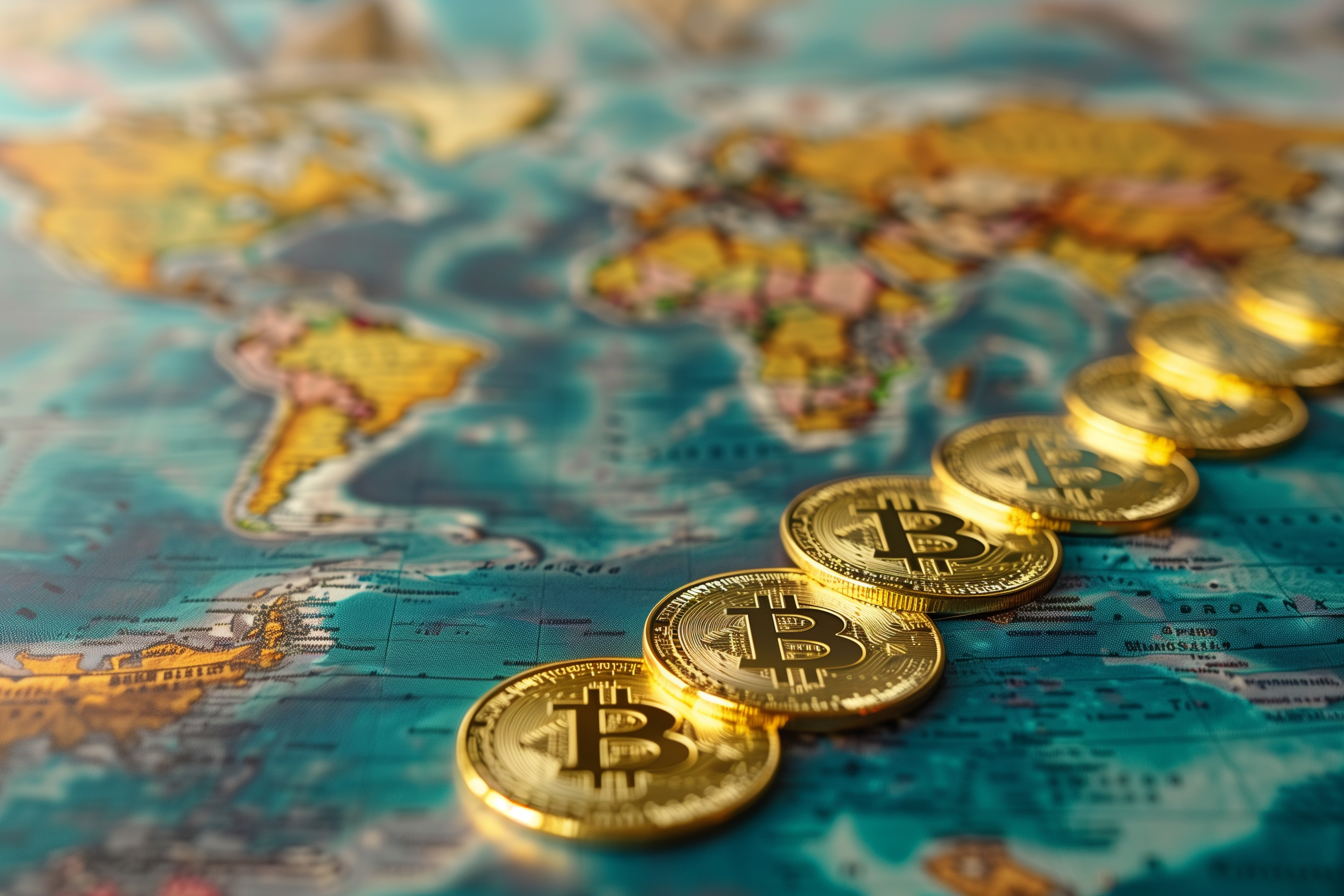 Dieses Bild zeigt eine Draufsicht auf goldene Bitcoinmünzen, die auf einer Weltkarte verteilt sind. Die Farbpalette ist hauptsächlich in Pastelltönen von Grün und Gelb gehalten, was eine ruhige und harmonische Stimmung vermittelt.