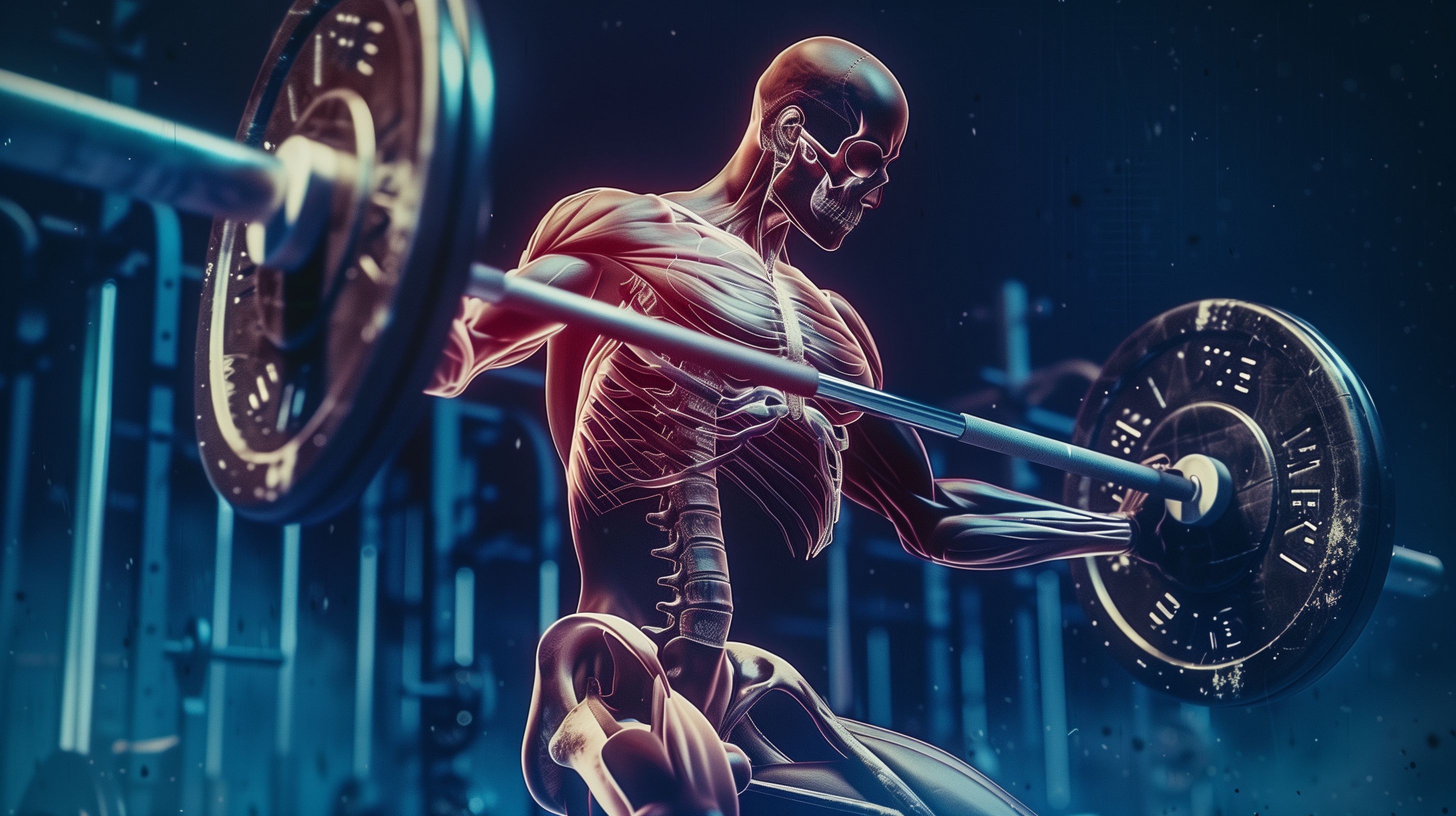 Das Bild zeigt ein detailliertes anatomisches Modell eines Bodybuilders, der mit einer Hantelstange trainiert. Vor einem dunklen, blauen Hintergrund sind Muskeln und Knochen des Körpers in leuchtenden Rot- und Gelbtönen hervorgehoben. Die Perspektive ist auf den Oberkörper und die Arme des Athleten fokussiert, der sich in einer dynamischen Trainingsposition befindet. Dieses Foto eignet sich hervorragend als hochwertiges Stockfoto für Beiträge zu Themen wie Fitness, Gesundheit, Körperarbeit und Anatomie. Es ist in hoher Auflösung verfügbar und kann unter einer Creative-Commons-Lizenz kostenlos genutzt werden.
