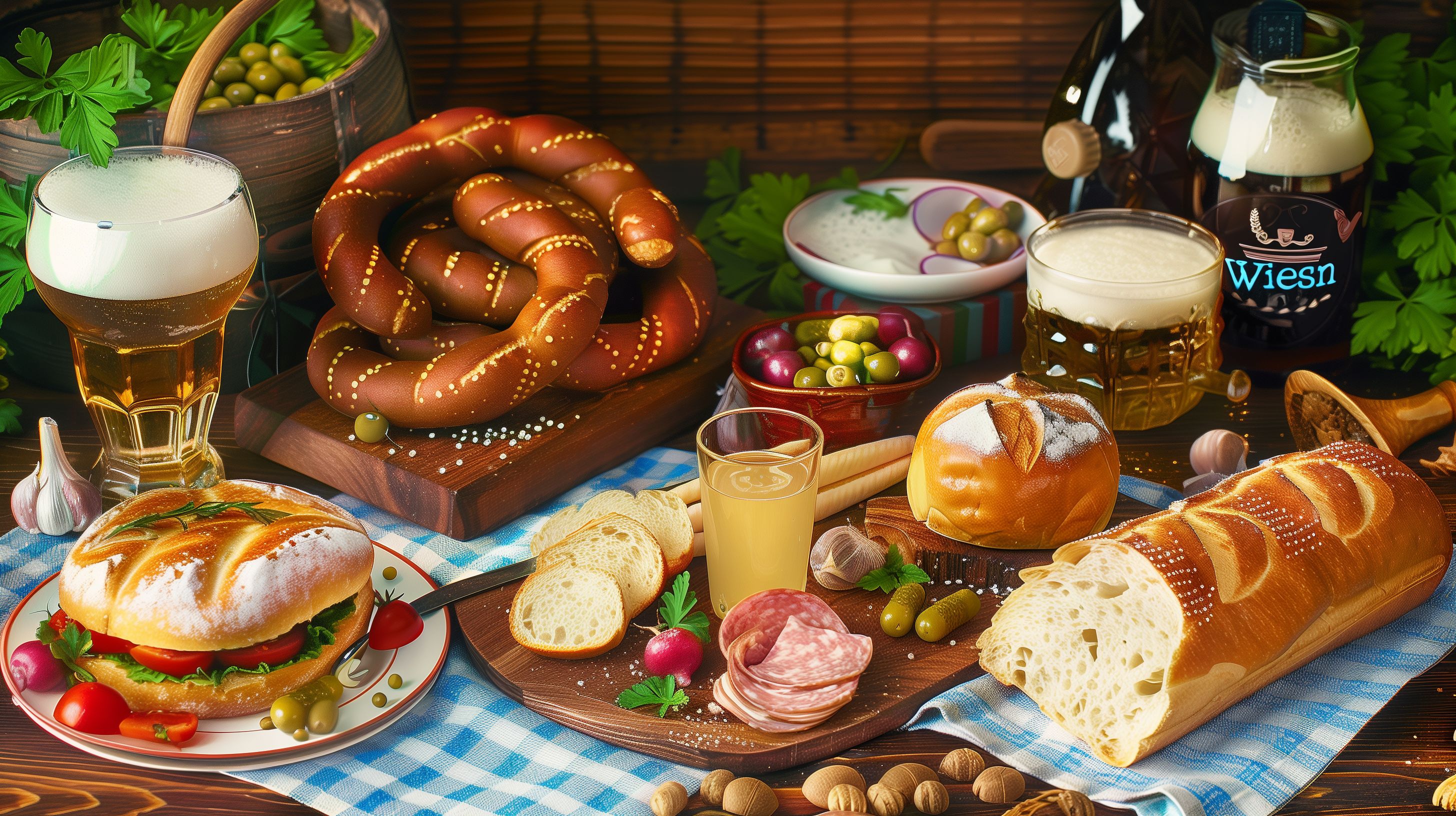Dieses Foto zeigt eine typische bayerische Wiesn-Brotzeit. Zu sehen sind verschiedene Würste, Brotlaibe, Bier in Gläsern, Gemüsesalat und weitere regionale Spezialitäten angerichtet auf einem rustikalen Holztisch mit karierten Tischdecken. Die Szene vermittelt eine gemütliche, authentische Atmosphäre und lässt den Betrachter die Tradition und Lebensfreude der Oktoberfestzeit spüren. Dieses kostenlose Stockfoto in hoher Auflösung eignet sich perfekt für Blogbeiträge, Newsletter, Social-Media-Posts oder Werbematerial rund um bayerische Gastronomie und Kulinarik unter der Creative-Commons-Lizenz.