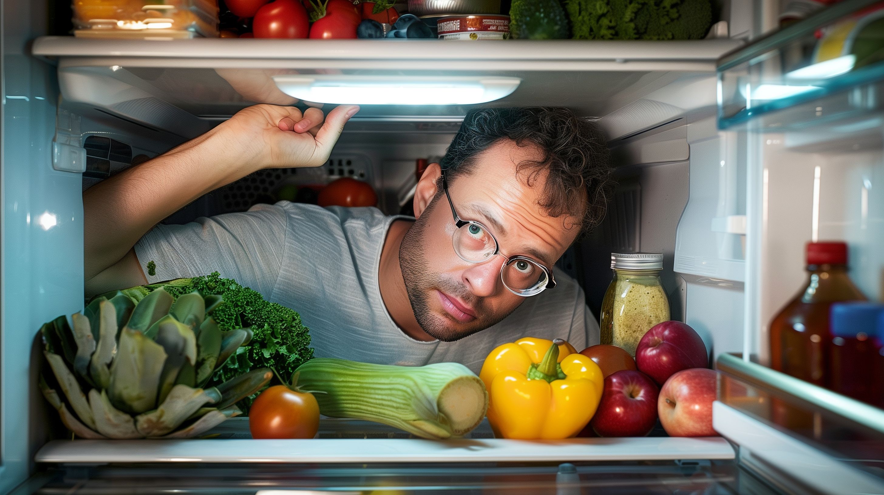 Das Bild zeigt einen jungen Mann, der tief in einen prall gefüllten Kühlschrank blickt. Umgeben von Obst, Gemüse und anderen frischen Lebensmitteln, wirkt er nachdenklich und konzentriert. Die sorgfältig arrangierte Anordnung der Produkte im Kühlschrankinneren verleiht der Szene eine fast künstlerische Atmosphäre. Dieses Stockfoto könnte für Artikel zum Thema gesunde Ernährung, Lebensmittellagerung oder Kochrezepte genutzt werden. Es ist in hoher Auflösung verfügbar und unter einer Creative-Commons-Lizenz frei nutzbar.