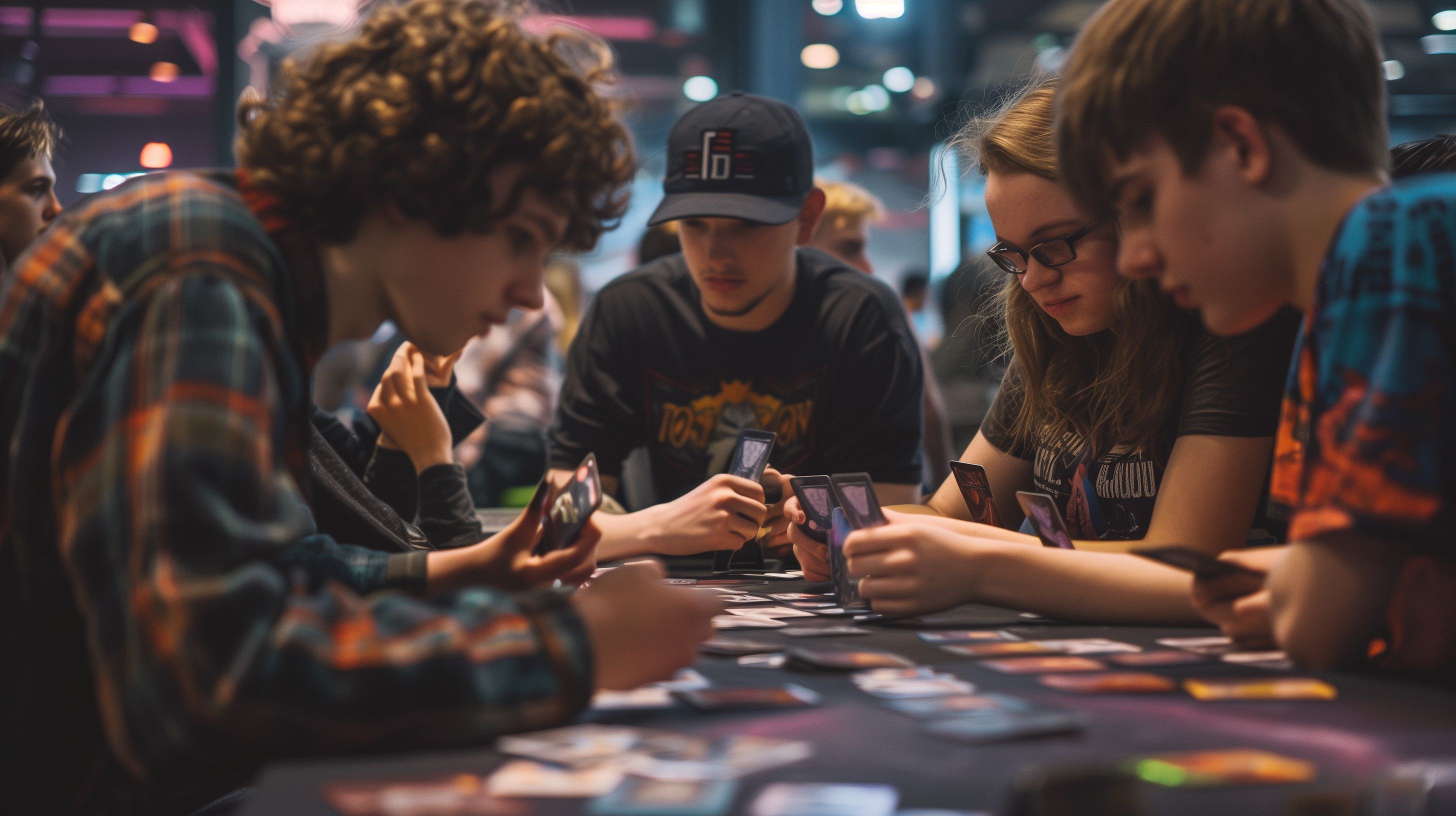 Das Foto zeigt eine Gruppe junger Menschen, die gemeinsam ein Sammelkartenspiel spielen. Sie sitzen an einem Tisch und nutzen ihre Smartphones, um möglicherweise Spielzüge oder andere Informationen abzurufen. Die Szenerie ist in ein dunkles Neonlicht getaucht, was eine stimmungsvolle, fast futuristische Atmosphäre erzeugt. Dieses Stockfoto eignet sich hervorragend für die Verwendung in Blogbeiträgen, Newslettern oder Werbematerialien, die sich um Themen wie Freizeit, Gaming oder Jugendkultur drehen. Es ist in hoher Auflösung und unter einer Creative-Commons-Lizenz verfügbar, sodass es frei genutzt werden kann.