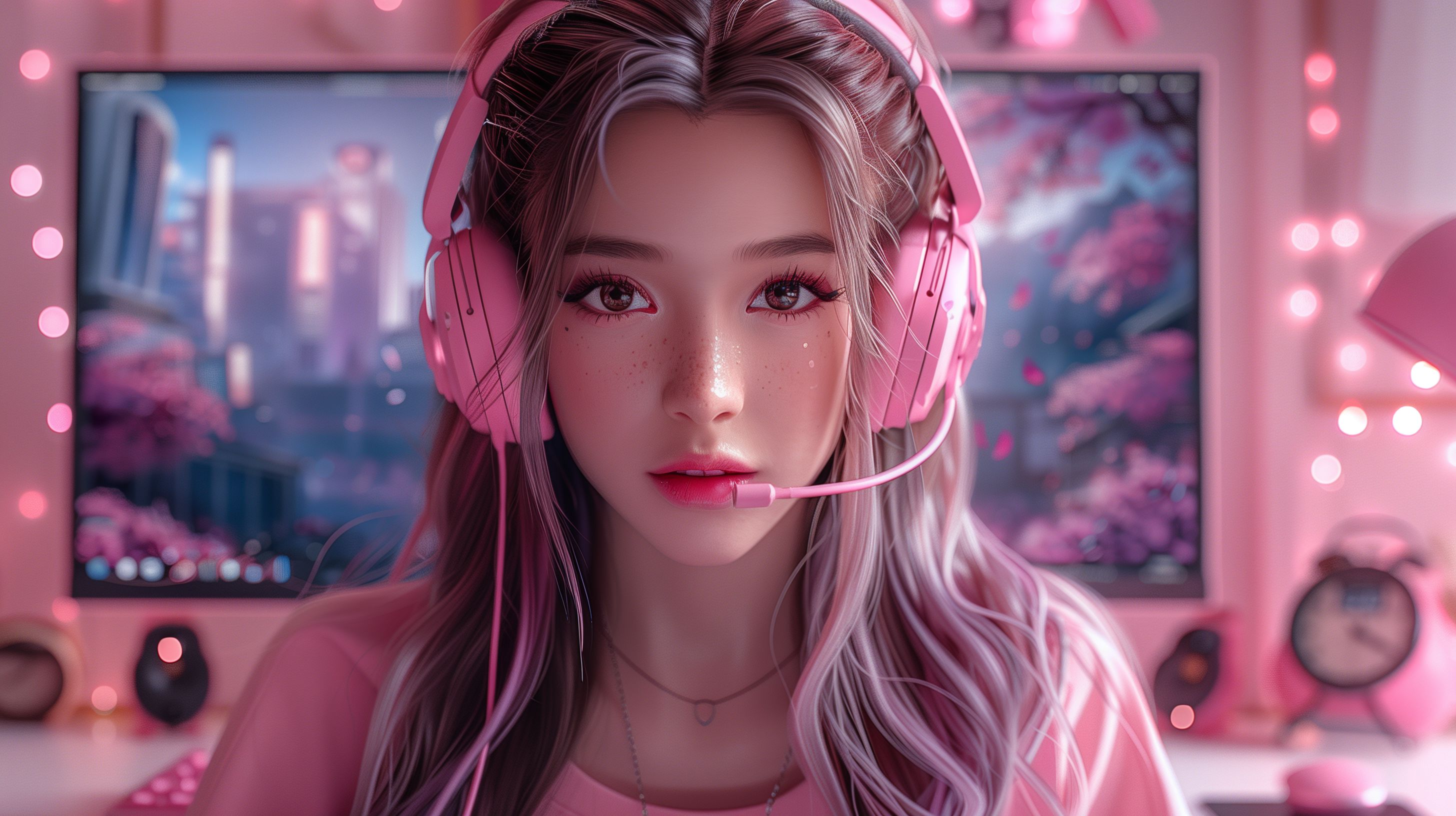 Das Bild zeigt eine junge Frau mit pink-blonden, gerahmten Haaren, die ein hochwertiges Gaming-Headset trägt. Sie blickt direkt in die Kamera und scheint konzentriert und fokussiert. Im Hintergrund erkennt man weitere Gaming-Ausrüstung, Displays und Dekorationselemente in einem rosafarbenen Farbschema. Dieses Foto eignet sich gut als Stockfoto für Blogs, Social-Media-Posts und Werbematerialien rund um Gaming, Streaming, Unterhaltung und Kreativität. Es ist in hoher Auflösung und unter einer Creative-Commons-Lizenz verfügbar.