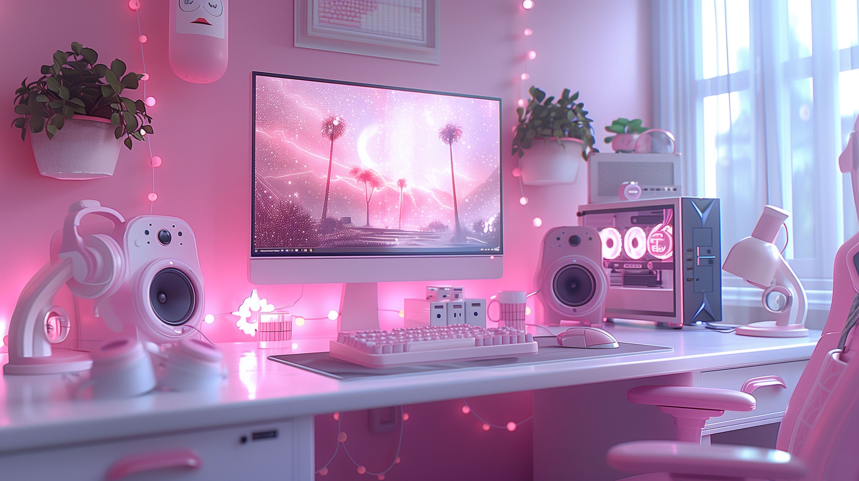 Dieses faszinierende Foto zeigt einen rosa beleuchteten Gaming-Arbeitsplatz mit vielfältigem Zubehör. Der Schreibtisch ist mit einer aufwändig dekorierten Tastatur, Maus, Lautsprechern und einem großen Bildschirm ausgestattet, auf dem ein stimmungsvoller Hintergrund mit glitzernden Pusteblumen zu sehen ist. Die Beleuchtung in Rosa verleiht dem Raum eine gemütliche und kreative Atmosphäre. Dieses hochwertige Stockfoto ist kostenlos und in hoher Auflösung unter einer Creative Commons-Lizenz verfügbar, ideal für den Einsatz in Blogs, Newslettern, Social-Media-Beiträgen oder Werbematerialien.