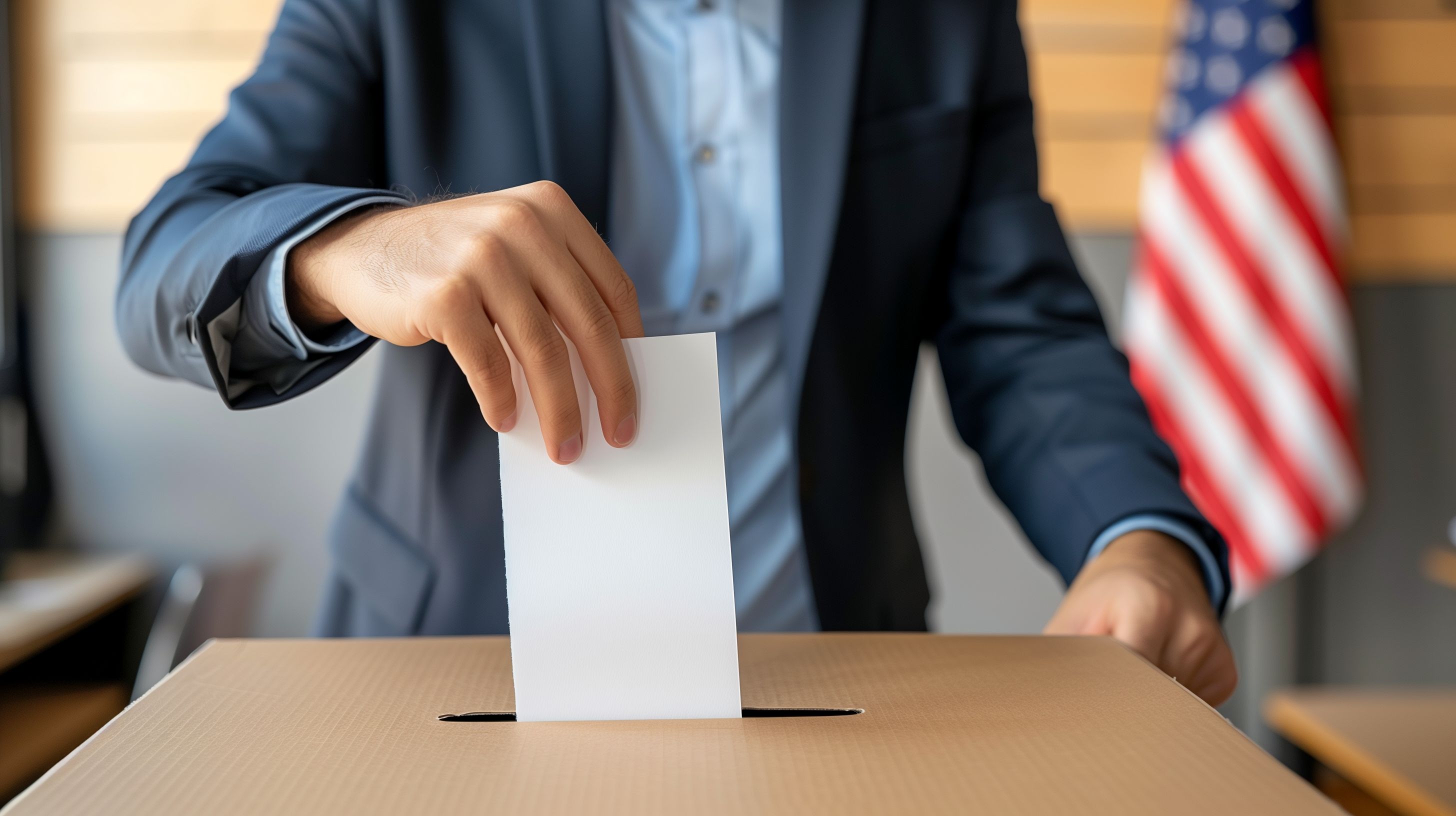 Das Bild zeigt einen Mann in einem Anzug, der einen Wahlzettel in eine Urne einwirft. Hinter ihm hängt die amerikanische Flagge an der Wand, was den Kontext einer US-amerikanischen Wahl verdeutlicht. Die Szene vermittelt den Eindruck eines Wahllokals oder eines politischen Büros, in dem der Bürger sein demokratisches Recht zur Stimmabgabe wahrnimmt. Das Foto eignet sich hervorragend als kostenloses Stockfoto für Beiträge rund um Themen wie Demokratie, Politik, Wahlen oder das Wahlsystem in den Vereinigten Staaten. Mit seiner hohen Auflösung und der freien Nutzbarkeit unter einer Creative-Commons-Lizenz bietet es vielfältige Einsatzmöglichkeiten in Blogs, Newslettern, Social-Media-Posts oder Werbematerialien.