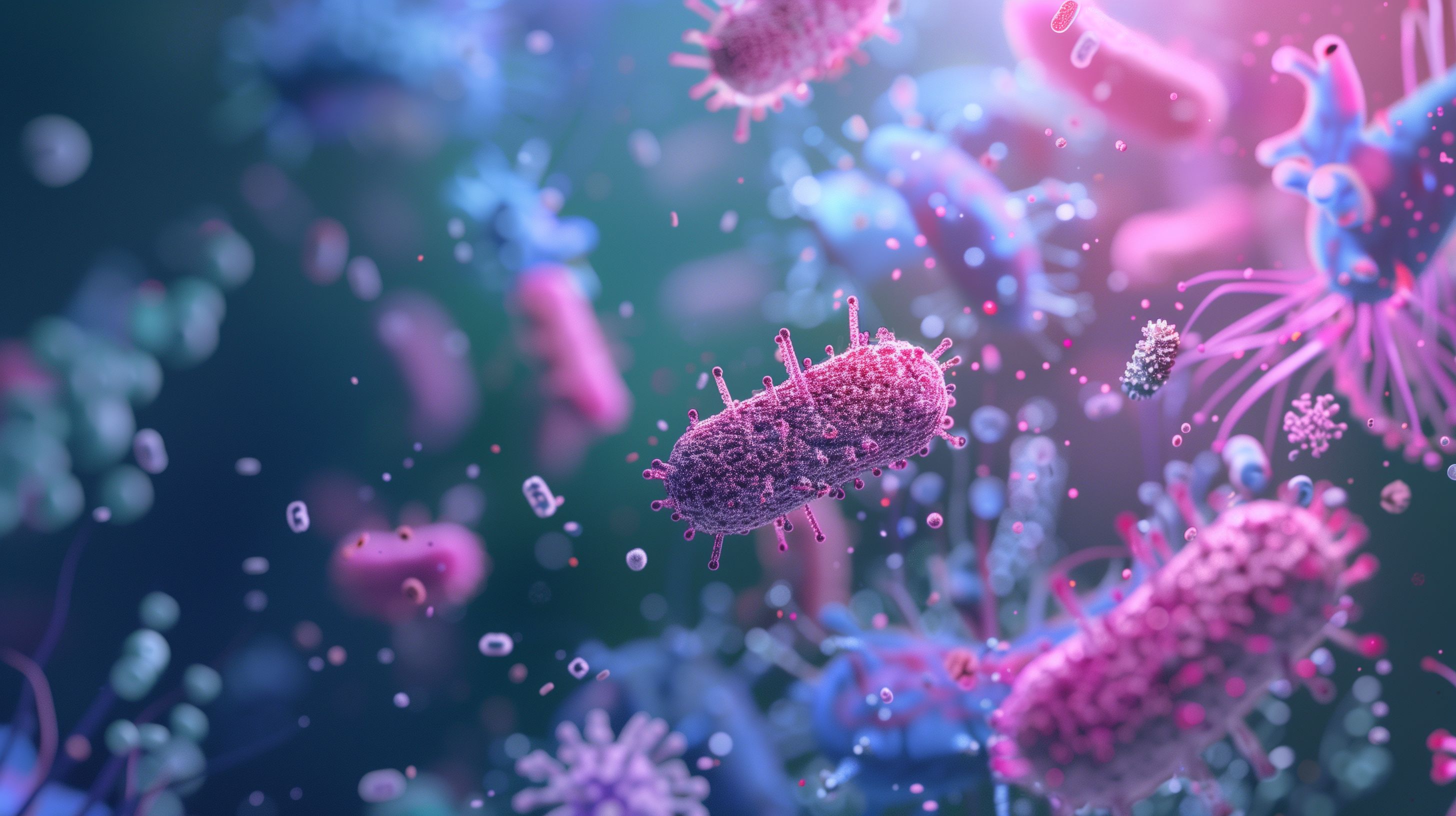 Dieses faszinierende Foto zeigt eine Nahaufnahme von mikroskopisch kleinen Bakterien, die in einem bunten, surrealen Umfeld schweben. Die detailreiche Aufnahme gewährt einen einzigartigen Einblick in die faszinierende Welt der Mikrobiologie und Gesundheitsforschung. Das Bild eignet sich hervorragend für den Einsatz in Artikeln, Blogbeiträgen oder Social-Media-Posts zu Themen wie Infektionen, Virologie oder allgemeine Gesundheit. Als hochauflösendes, kostenloses Stockfoto unter der Creative-Commons-Lizenz kann es vielfältig in digitalen Projekten verwendet werden.