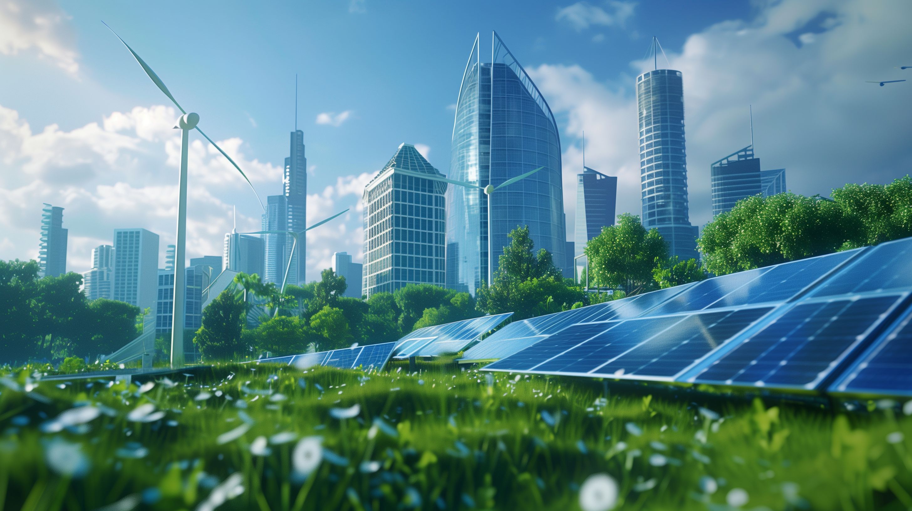 Dieses Bild zeigt eine moderne, nachhaltige Großstadt mit Wolkenkratzern, die von Sonnenenergie und Windkraft angetrieben werden. Im Vordergrund befinden sich große Photovoltaikanlagen, die in eine üppige, grüne Parklandschaft eingebettet sind. Die futuristischen Hochhäuser ragen in den blauen Himmel hinauf, umgeben von Wolken und Windkraftanlagen. Diese Szene vermittelt ein Bild einer umweltfreundlichen, innovativen Stadtentwicklung, die Energie aus erneuerbaren Quellen nutzt. Das Foto eignet sich hervorragend als kostenloses Stockfoto für Blogs, Newsletter oder Werbematerial zum Thema Nachhaltigkeit, Stadtplanung und erneuerbare Energien. Die hohe Auflösung und Creative-Commons-Lizenz machen es zu einer flexibel einsetzbaren Bildressource.