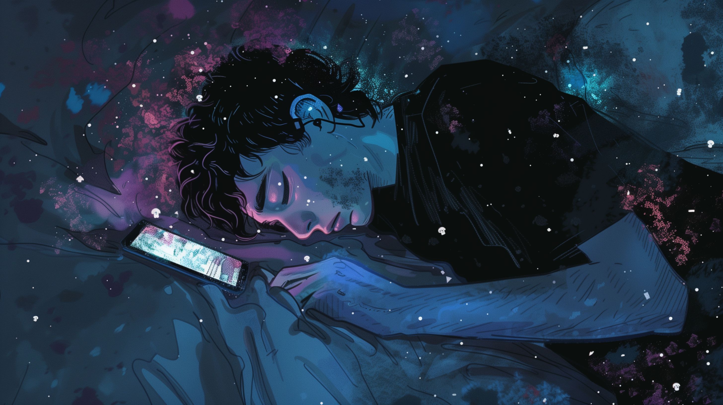 Die Illustration zeigt einen jungen Menschen, der tief schlafend auf einem Bett liegt und ein Smartphone in der Hand hält. Das Bild ist in dunklen, mystischen Farben gehalten und gibt den Eindruck eines Traum-Universums wieder, in dem der junge Mensch versunken ist. Die digitale Abhängigkeit, symbolisiert durch das Smartphone, steht im Kontrast zu der fantastischen, sternübersäten Umgebung. Dieses Stockfoto eignet sich perfekt für Beiträge zu Themen wie Technologie, Lifestyle, Gesundheit und Beziehungen, bei denen die Auswirkungen der digitalen Welt auf den Menschen im Fokus stehen. Mit seiner hohen Auflösung und Creative-Commons-Lizenz ist es ein kostenloses, vielseitig einsetzbares Bildmaterial für Blogs, Newsletter, Social-Media-Kanäle und Werbematerialien.