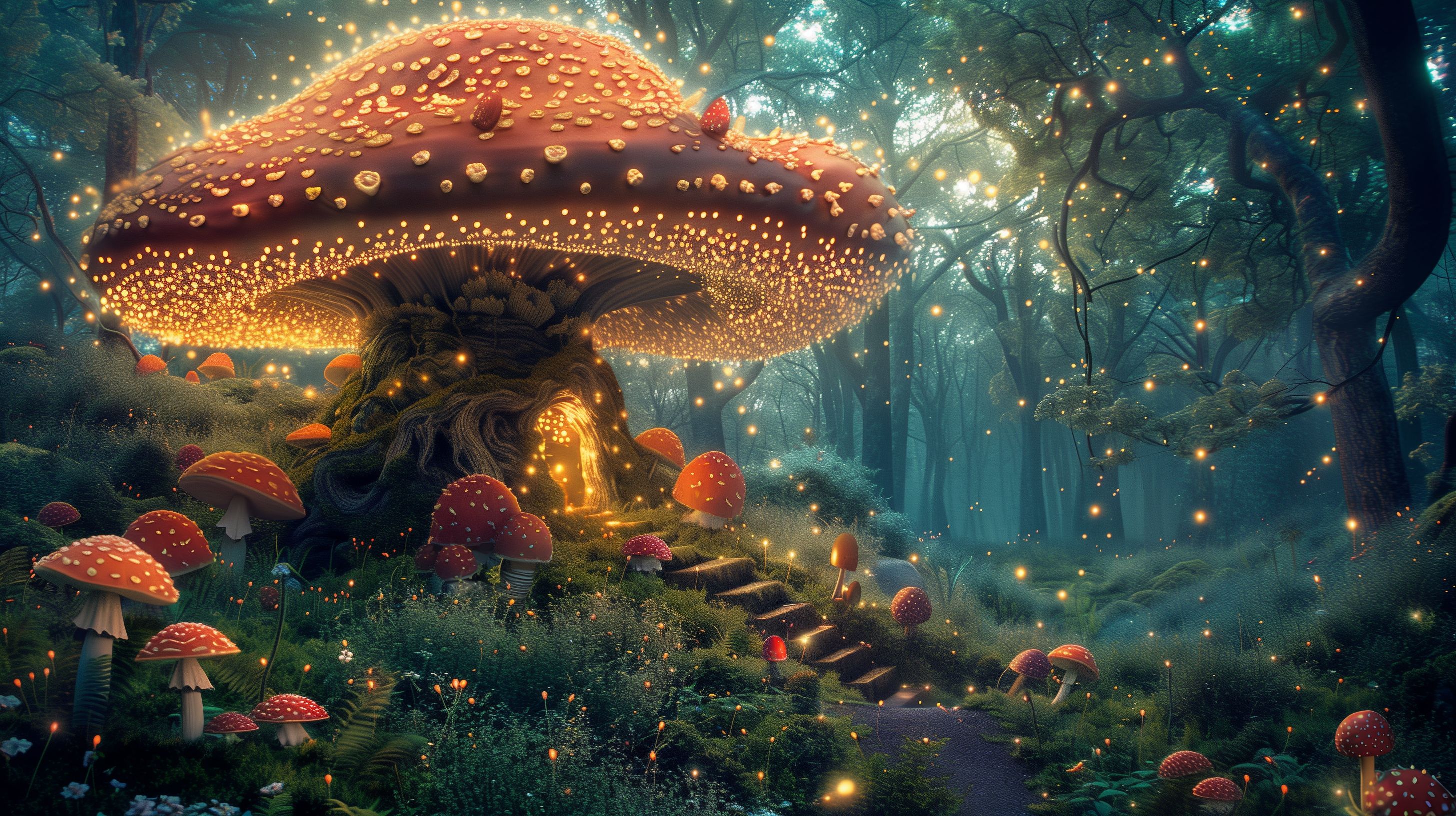 Diese faszinierende digitale Illustration zeigt einen märchenhaften Pilzwald, der von einem sanften, mystischen Licht durchflutet ist. Der Blick führt tiefer in den Wald hinein, wo riesige, leuchtende Pilze aus dem Boden wachsen und eine einzigartige, fantastische Atmosphäre schaffen. Die detailreichen, üppigen Farben sowie die Komposition mit den geschwungenen Pfaden und Stufen verleihen dem Bild eine surreale, feenhafte Anmutung. Dieses kostenlose Stockfoto in hoher Auflösung eignet sich ideal für die Verwendung in Blogs, Newslettern, sozialen Medien oder für dekorative Zwecke unter einer Creative-Commons-Lizenz.