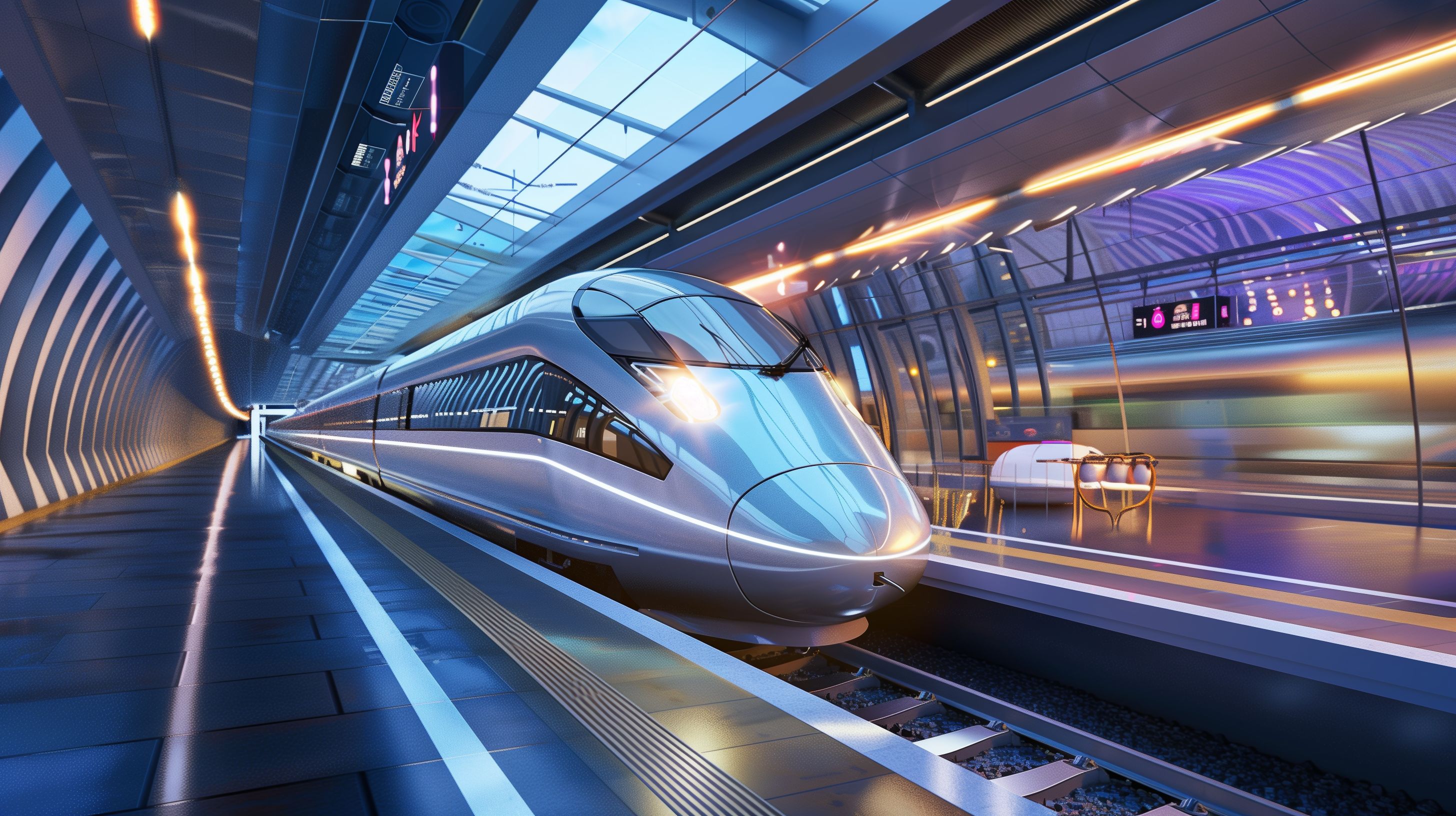 Dieses beeindruckende Bild zeigt einen modernen Hochgeschwindigkeitszug, der gerade in eine futuristische Bahnhofshalle einfährt. Die Szene ist geprägt von dynamischen Linien, leuchtenden Farben und einer Atmosphäre des Fortschritts. Die hochglänzende Fassade des Zuges reflektiert das Licht der Beleuchtung und scheint beinahe zu schweben, während er durch den Tunnel rast. Der Kontrast zwischen der technischen Präzision des Fahrzeugs und der architektonischen Eleganz der Bahnhofshalle erschafft ein Bild von Mobilität und Innovation. Dieses Stockfoto eignet sich hervorragend für Verwendungen in Blogs, Newslettern, Social-Media-Beiträgen oder Werbekampagnen, die Themen wie Fortschritt, Zukunft, Verkehr oder Infrastruktur visualisieren möchten. Mit seiner hohen Auflösung und Creative-Commons-Lizenz ist es kostenfrei für verschiedenste Zwecke nutzbar.