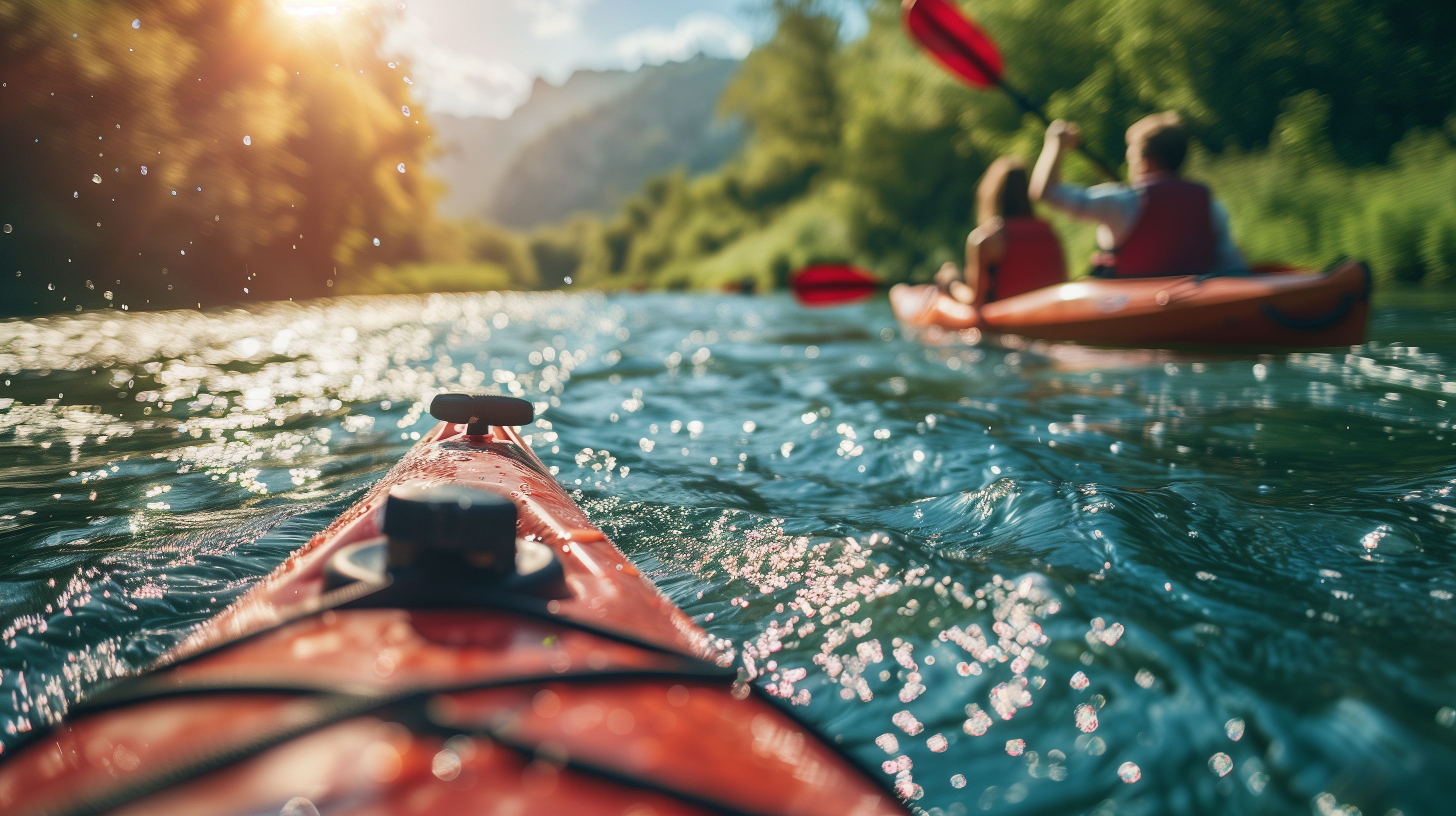 Dieses faszinierende Stockfoto zeigt ein Paar, das in einem roten Kajak auf einem idyllischen See oder Fluss paddelt. Die Szenerie ist atemberaubend - im Hintergrund erstrecken sich grüne Berge und Wälder, während die Sonne sanft auf das Wasser scheint und ein funkelndes Spiel von Licht und Schatten erzeugt. Die Paddler sitzen ruhig in ihrem Boot, umgeben von der friedlichen Natur und genießen ganz offensichtlich dieses Abenteuer voller Freiheit und Entspannung.