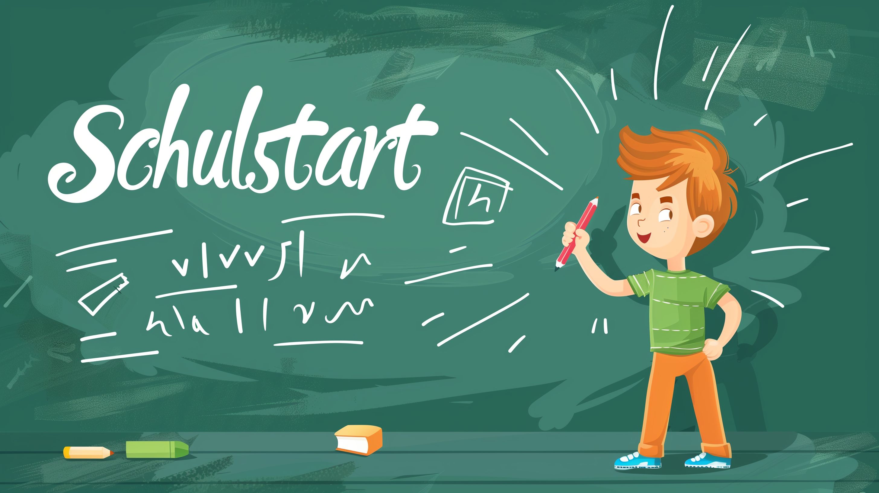 Das Bild zeigt einen fröhlichen Jungen, der voller Begeisterung an einer Tafel in einem Klassenzimmer steht und etwas aufschreibt. Er trägt ein grünes T-Shirt und orange Hosen und strahlt eine positive Stimmung aus, die perfekt zum Thema Schulbeginn passt. Die Illustration ist in einem cartoon-ähnlichen Stil gehalten und hebt sich durch die kräftigen Farben von der dunkelgrünen Tafel ab. Dieses Stockfoto eignet sich hervorragend für die Verwendung in Blogbeiträgen, Newslettern, Social-Media-Posts oder Werbematerialien rund um das Thema Schule, Bildung und Lernen. Das hochauflösende Bild ist kostenlos und unter einer Creative-Commons-Lizenz nutzbar.