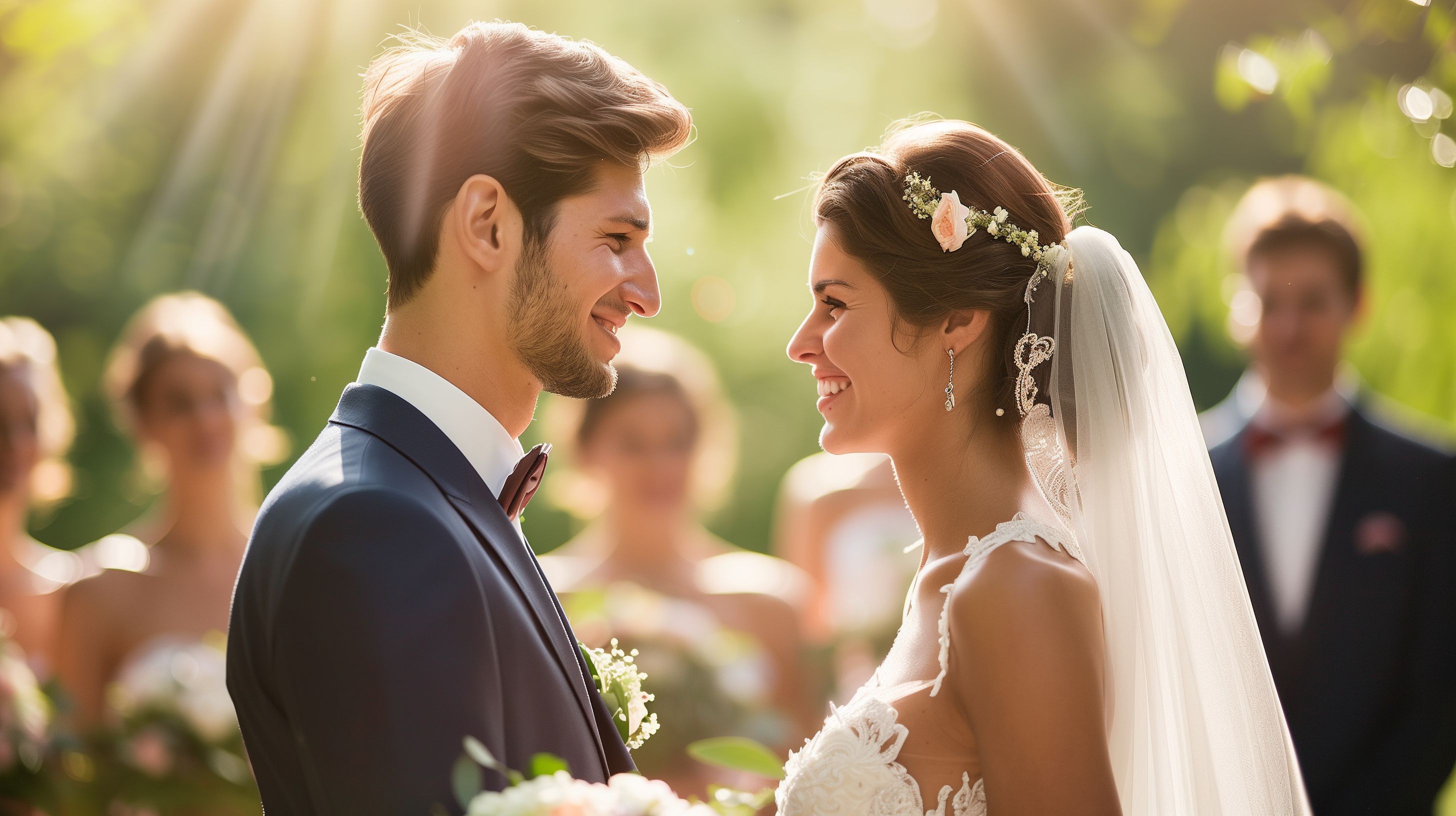 Das Foto zeigt eine romantische Hochzeitszeremonie im Freien. Das Brautpaar steht im Mittelpunkt, lächelnd und glücklich in die Augen blickend. Die Braut trägt ein elegantes, weißes Hochzeitskleid mit Spitzendetails und einer leichten Schleppe. Ihr Bräutigam ist in einen dunklen Anzug mit Krawatte gekleidet. Sie sind umgeben von einem liebevoll dekorierten Ambiente mit Blumen, Büschen und grüner Natur, die eine idyllische Stimmung schaffen. Das Sonnenlicht zaubert eine warme, natürliche Atmosphäre und hebt die Freude des Paares hervor. Dieses stimmungsvolle Foto eignet sich hervorragend als kostenloses Stockfoto für Hochzeitsthemen, Social-Media-Posts, Blogbeiträge oder Werbematerialien in hoher Auflösung und unter Creative-Commons-Lizenz.