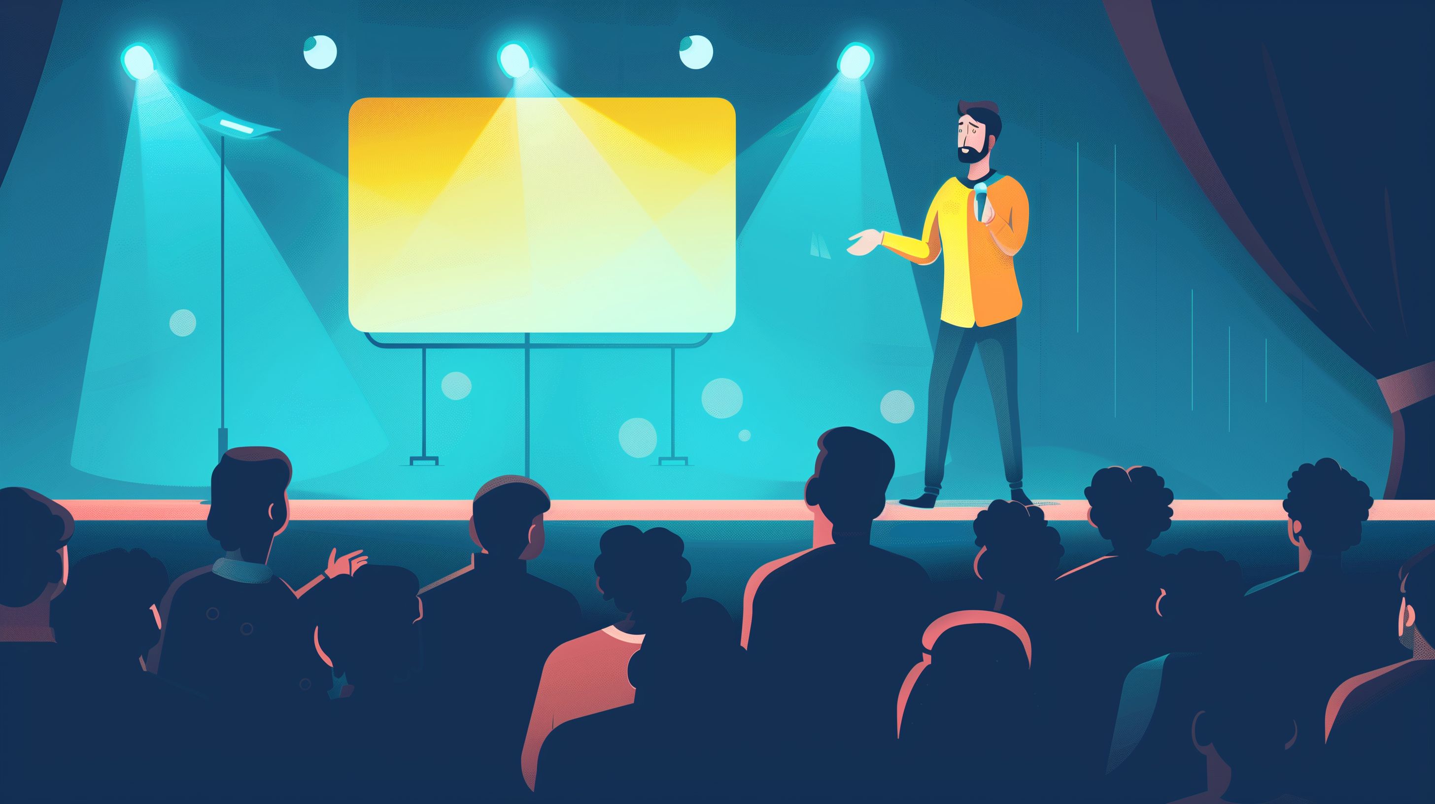 Diese vektorielle Illustration zeigt einen selbstbewussten Redner, der eine Präsentation vor einem Publikum hält. Die Szene spielt auf einer Bühne mit blauem Hintergrund, der von leuchtenden Scheinwerfern erhellt wird. Der Referent steht im Mittelpunkt und gestikuliert mit den Händen, um seine Ausführungen zu unterstützen. Das Publikum sitzt im Halbdunkel und blickt konzentriert auf den Vortragenden. Diese Szene eignet sich hervorragend als kostenloses Stockfoto für Blogs, Newsletter, Social-Media-Beiträge und Werbekampagnen rund um Themen wie Präsentationen, Vorträge, Konferenzen oder Seminare. Die hochauflösende Vektorillustration kann unter Creative-Commons-Lizenz frei genutzt werden.
