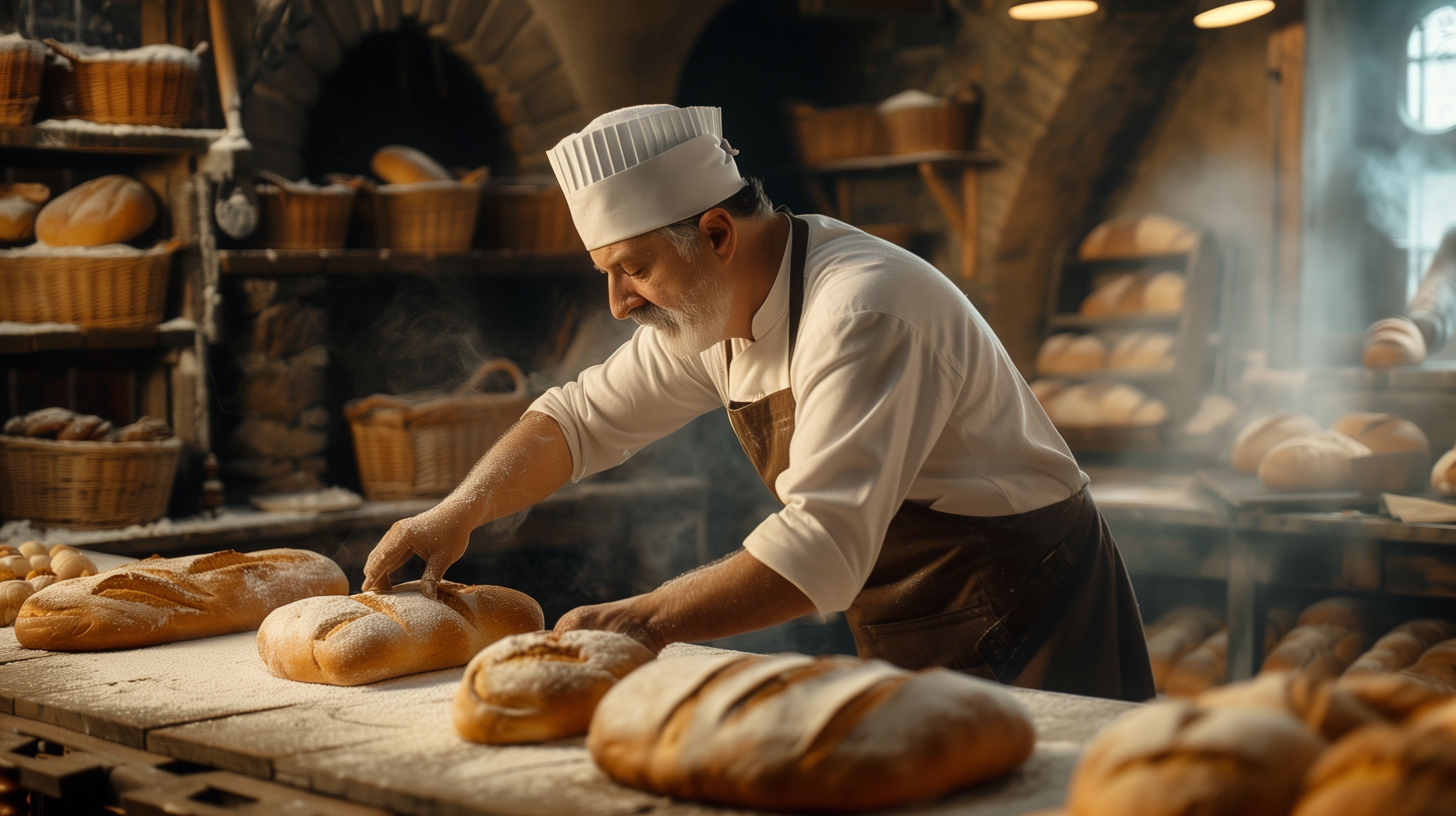 Das Bild zeigt einen erfahrenen Bäcker bei der Arbeit in einer traditionellen Backstube. Er steht an einem hölzernen Arbeitsplatz und formt sorgfältig Brotkrumen zu frischen Laiben. Der Raum ist geprägt von historischen Elementen wie dem großen Holzofen und den Körben voller Brote. Eine leichte Nebelwolke legt sich über die Szene, was den Eindruck einer authentischen Atmosphäre verstärkt. Das Foto eignet sich ideal für die Verwendung in Artikeln oder Werbematerialien zu Themen wie Handwerkskunst, traditionelle Lebensmittelherstellung oder rustikale Kulinarik. Als hochwertiges Stockfoto in hoher Auflösung steht es unter einer Creative-Commons-Lizenz zur kostenlosen Nutzung zur Verfügung.