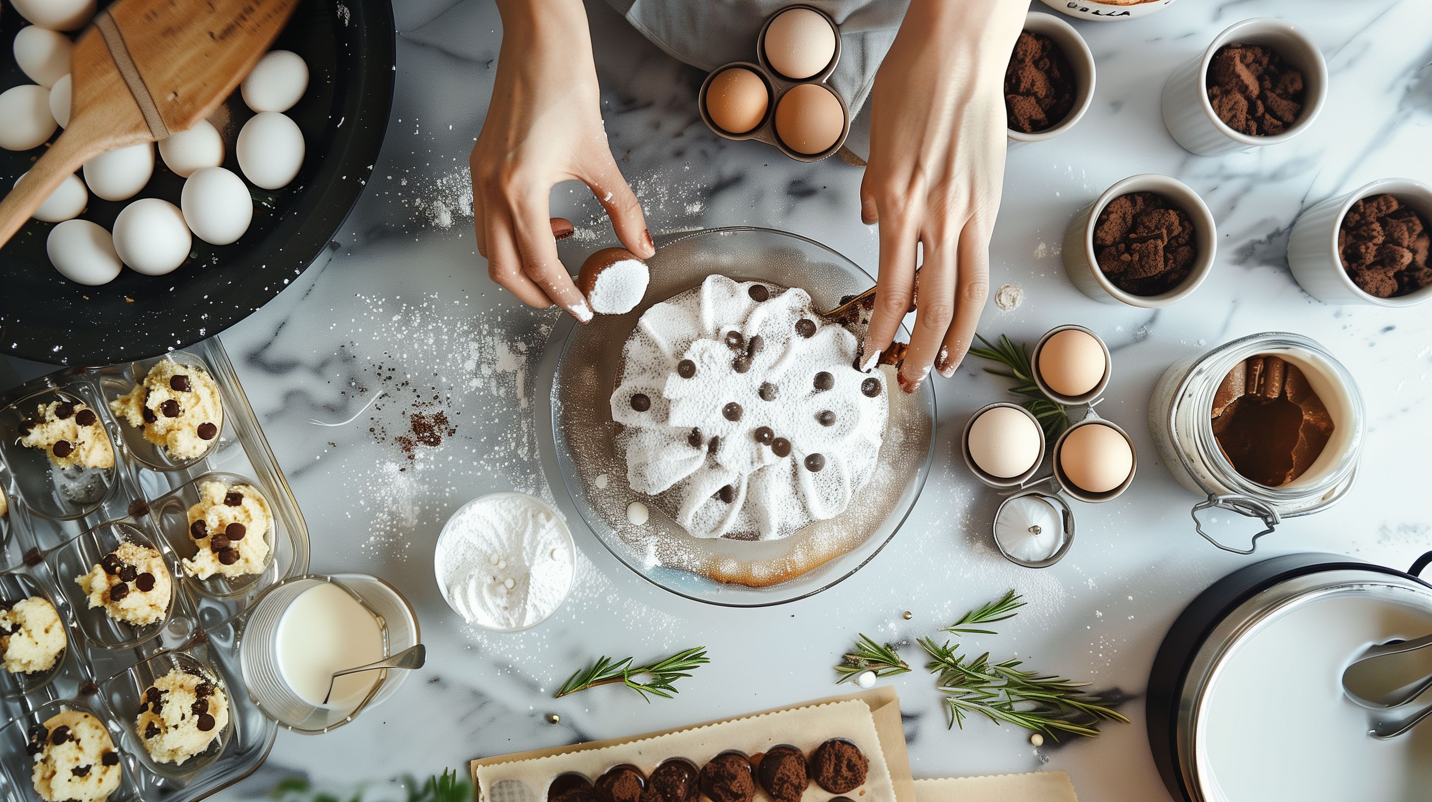 Dieses hochwertige Stockfoto zeigt eine rustikale Küchenszene mit verschiedenen Backzutaten und -utensilien auf einer eleganten Marmorplatte. Im Vordergrund sind Eier, Mehl, Kakaopulver und Backformen zu sehen, während im Hintergrund Hände beim Backen zu erkennen sind. Die Komposition in Grau-, Weiß- und Holztönen verleiht dem Bild eine stimmungsvolle, gemütliche Atmosphäre. Dieses hochauflösende Foto eignet sich hervorragend für Beiträge in Blogs, Newslettern oder Social-Media-Kanälen rund um das Thema Backen und Kochen. Es steht unter einer kostenlosen Creative-Commons-Lizenz zur Verfügung.