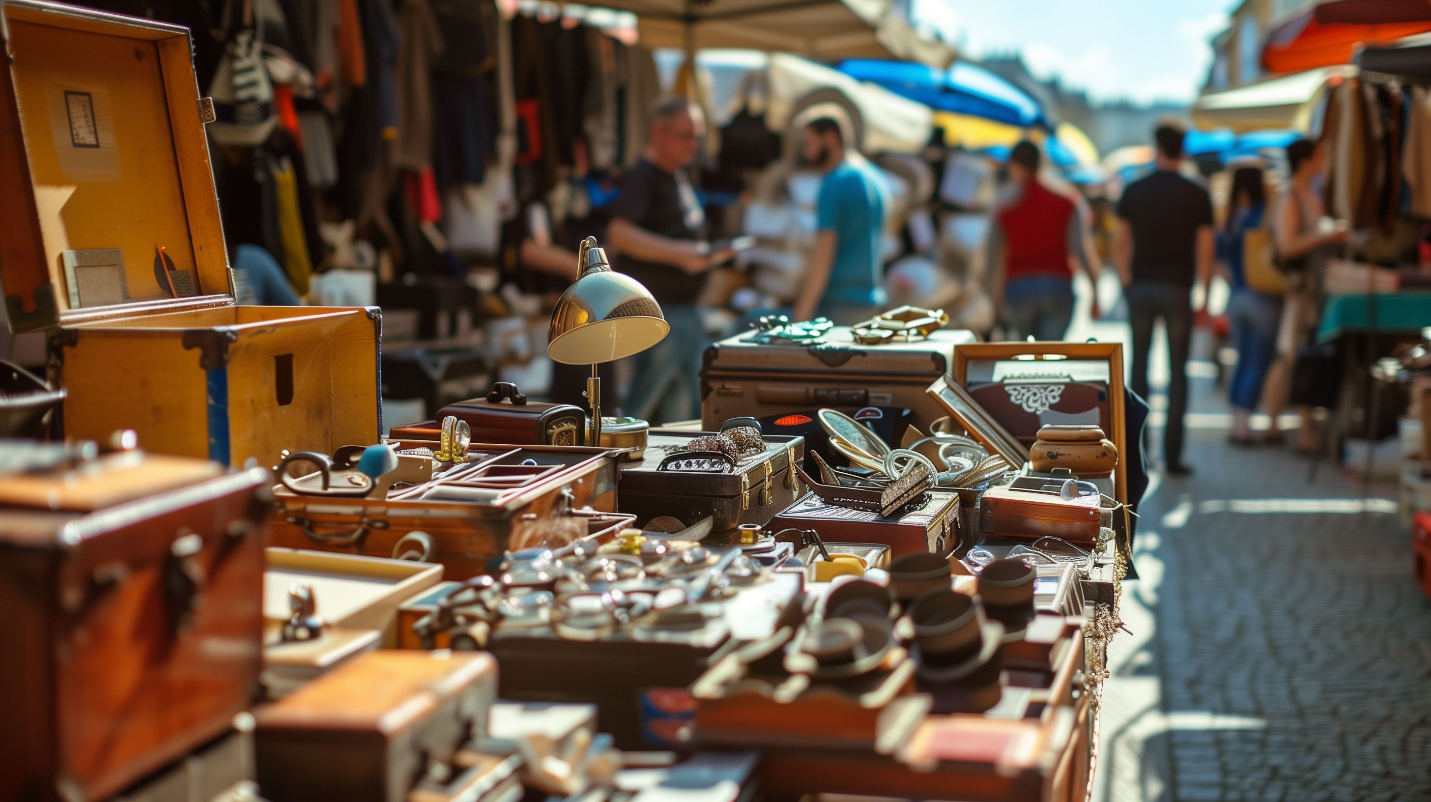 Dieses farbenfrohe Foto zeigt einen lebendigen Flohmarkt in einer Stadt. Im Vordergrund sind zahlreiche Stände mit allerlei Gegenständen zu sehen - von Vintage-Lampen über Schmuckstücke bis hin zu alten Büchern und Accessoires. Die Vielfalt der Artikel spiegelt die Kreativität und Individualität wider, die Flohmärkte ausmachen. Im Hintergrund sind Passanten zu erkennen, die durch die engen Gassen schlendern und nach besonderen Schätzen suchen. Die dynamische Szenerie vermittelt das lebendige, gesellige Treiben eines urbanen Flohmarktes, an dem jeder etwas Neues entdecken und mit nach Hause nehmen kann. Dieses kostenlose Hochauflösungsfoto eignet sich hervorragend für Blogs, Newsletter, Social-Media-Beiträge oder Werbematerialien rund um Themen wie Second-Hand, Nachhaltigkeit, Stadtkultur oder Einkaufserlebnisse.