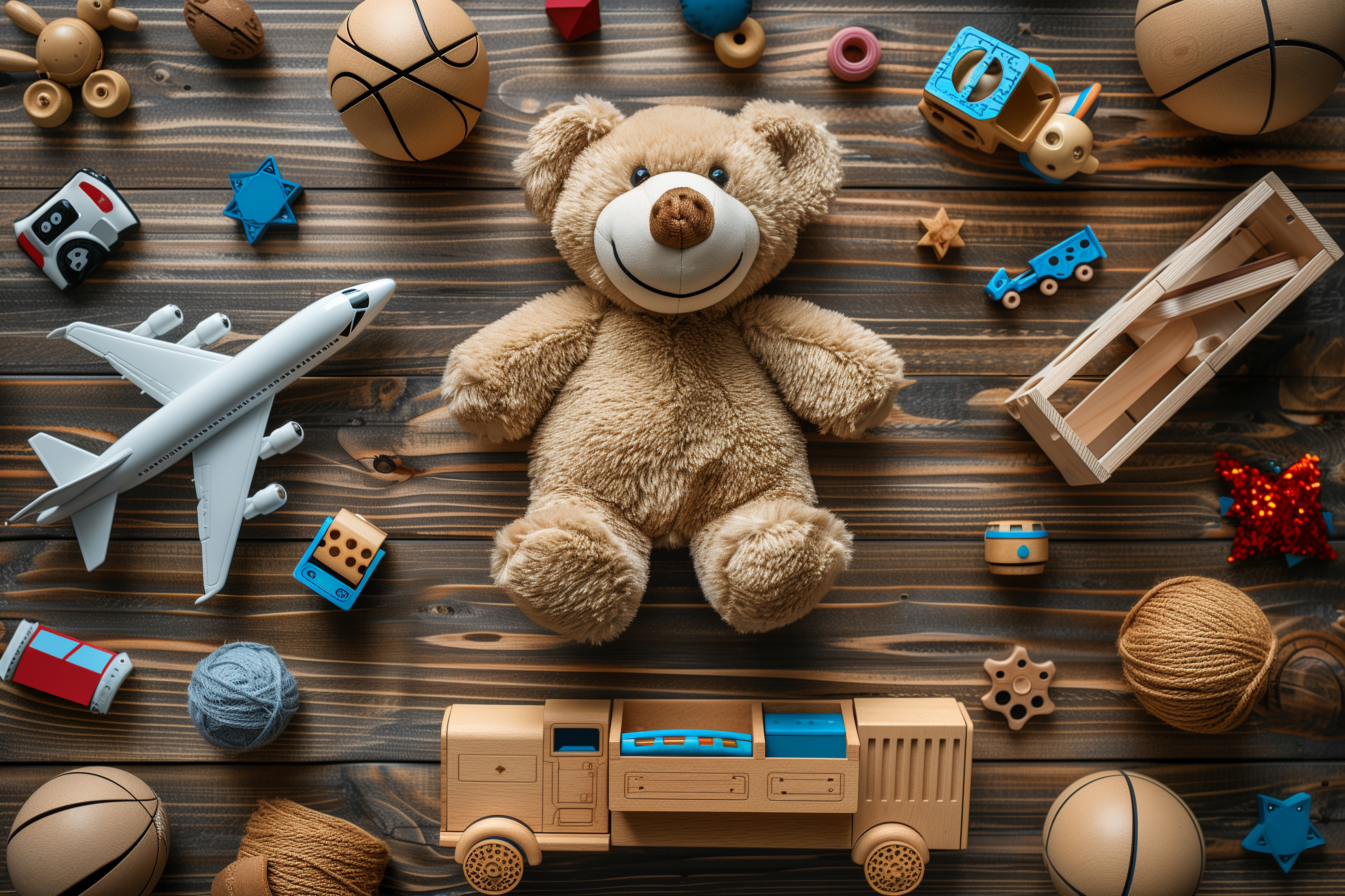 Dieses Foto zeigt eine bunte Anordnung von Spielzeugen und Dekorationselementen auf einem rustikalen Holzhintergrund. Im Mittelpunkt steht ein süßer, flauschiger Teddybär, umgeben von verschiedenen Holzspielzeugen wie einem Flugzeug, Autos, Würfeln und Bällen. Weitere Details wie Sterne, Wolle und kleine Kisten tragen zur gemütlichen und kreativen Atmosphäre bei. Die Komposition und die Verwendung natürlicher Materialien verleihen dem Bild einen nostalgischen, vintage-artigen Charakter, der perfekt für die Verwendung in Kindergarten-, Kindheits- oder Familienthemen geeignet ist.