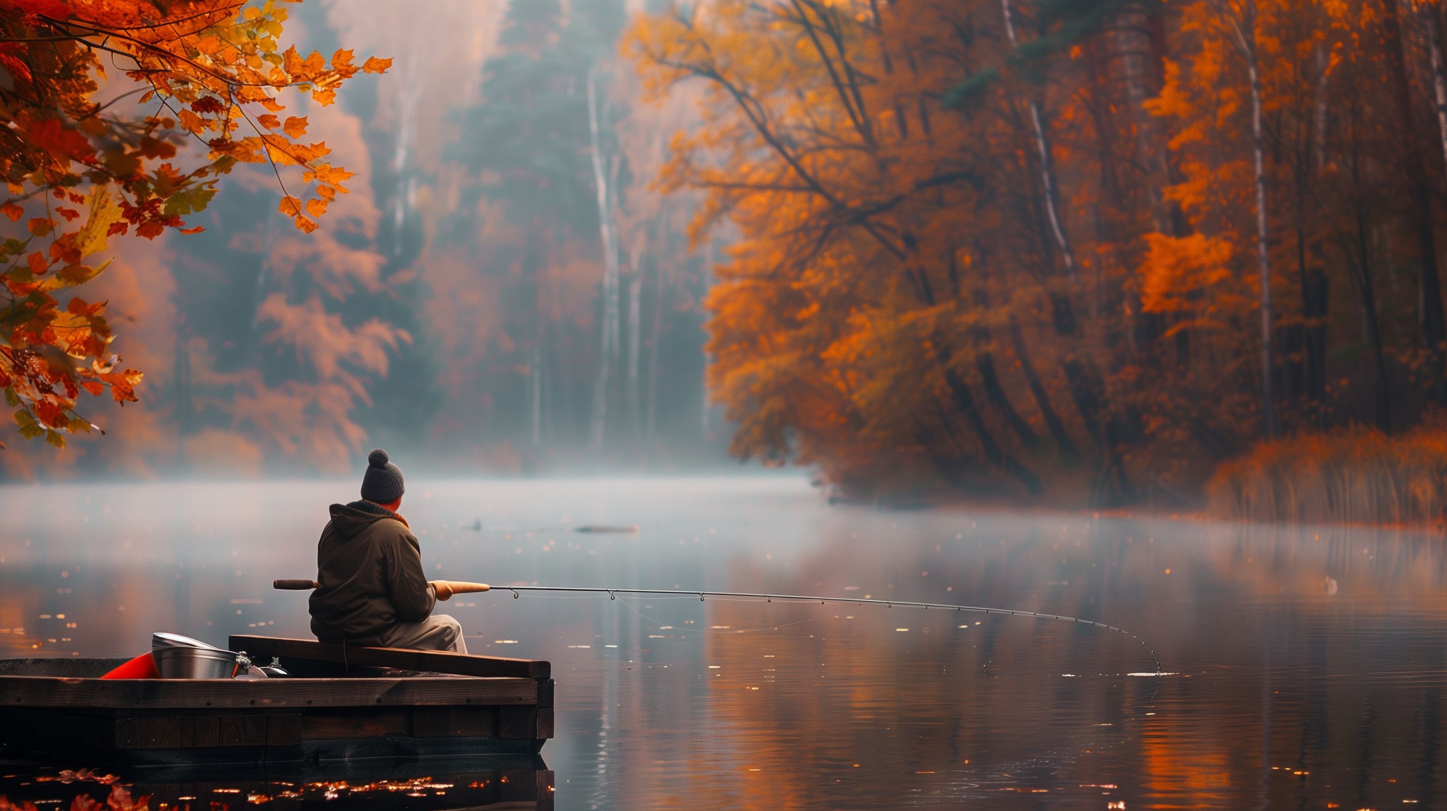 Dieses stimmungsvolle Foto zeigt einen Angler, der auf einem idyllischen See in einer herbstlichen Waldlandschaft fischt. Die Szene ist von einer mystischen Atmosphäre geprägt - der See liegt ruhig da, umgeben von leuchtend orangefarbenen Bäumen und leichtem Nebel. Der Angler sitzt konzentriert in seinem Holzboot und genießt die friedliche Umgebung. Das Bild vermittelt eine Stimmung der Ruhe und Entspannung und eignet sich hervorragend als kostenloses Stockfoto für Blogs, Websites oder Social-Media-Beiträge rund um die Themen Outdoor, Hobbys, Natur und Freizeit. Die hochauflösende Datei steht unter einer Creative-Commons-Lizenz zur freien Nutzung zur Verfügung.