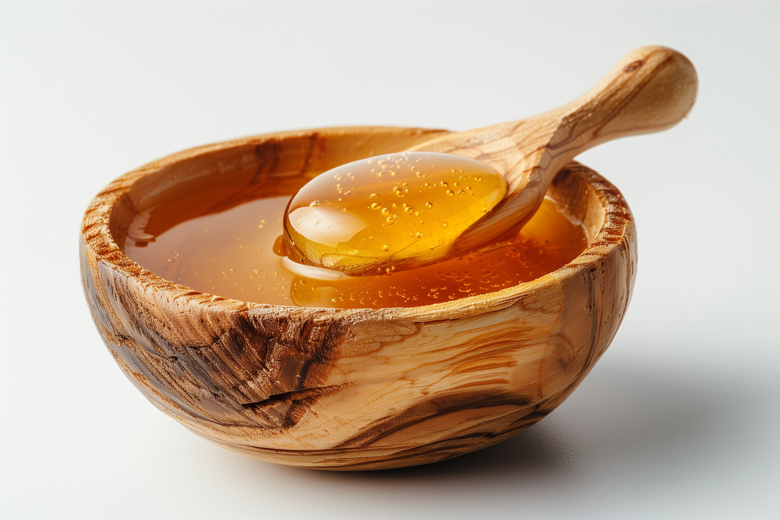 Das Foto zeigt eine hölzerne Schale mit goldgelber Honigglasur und einem Holzlöffel darin. Der Fokus liegt auf dem Löffel, der in die Honigglasur getaucht ist, wodurch einzelne Tropfen und Texturen sichtbar werden. Der ruhige, weiße Hintergrund lässt die natürlichen Farben und Materialien des Honigs und des Holzes besonders zur Geltung kommen. Dieses Stockfoto eignet sich hervorragend für Blogs, Newsletter, Social-Media-Posts oder Werbekampagnen im Lebensmittel-, Gesundheits- oder Kochbereich. Es ist in hoher Auflösung und unter einer Creative-Commons-Lizenz verfügbar.