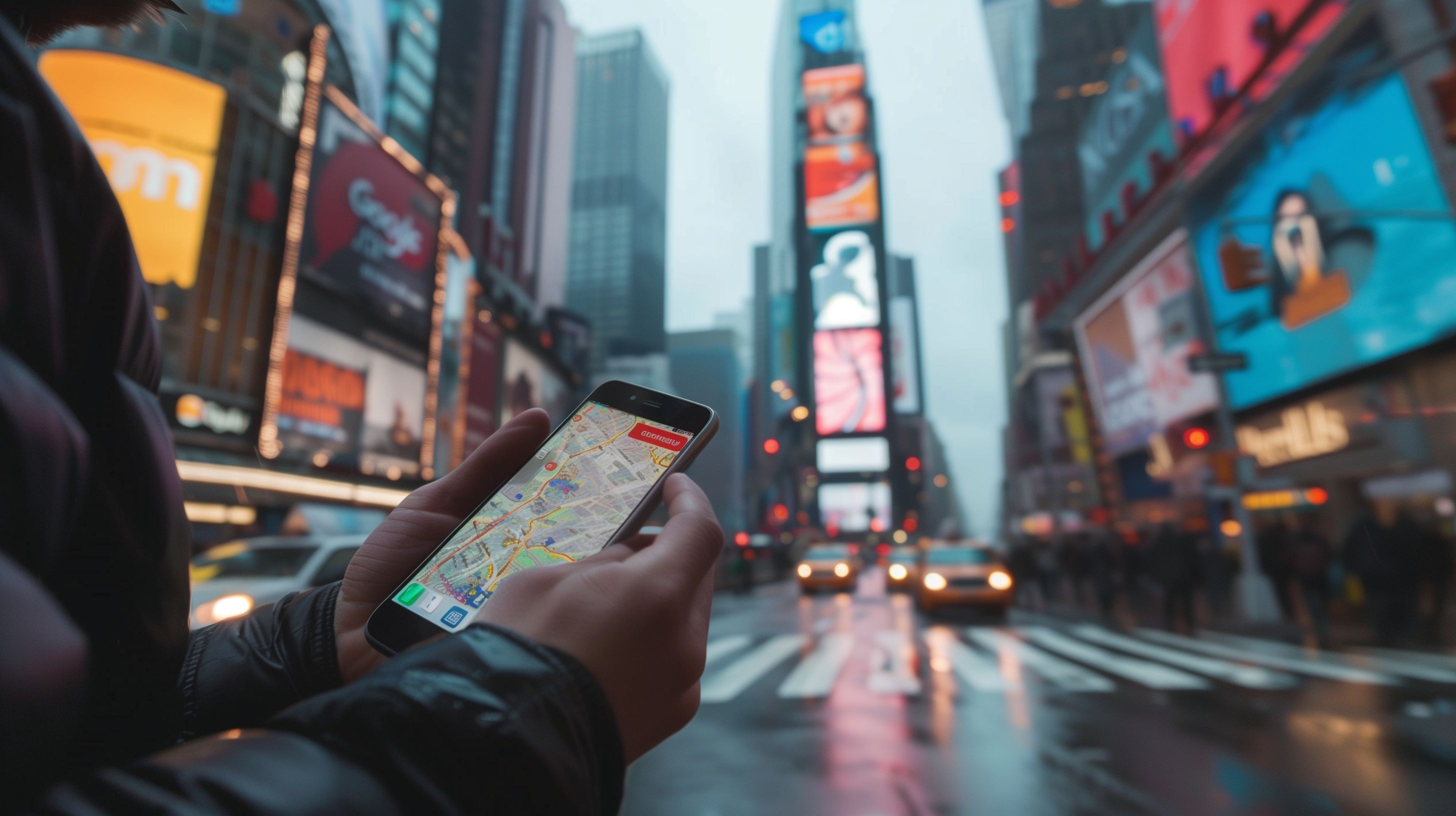 Das Bild zeigt eine Person, die auf ihrem Smartphone eine Karte oder Navigationssoftware verwendet, während sie sich in der Nacht auf den belebten Straßen von New York City befindet. Im Hintergrund sind die typischen Lichter und Werbetafeln des Times Square sowie andere Hochhäuser zu erkennen. Das Bild vermittelt den Eindruck der Mobilität, Technologie und des pulsierenden Stadtlebens in einer der bekanntesten Metropolen der Welt.
