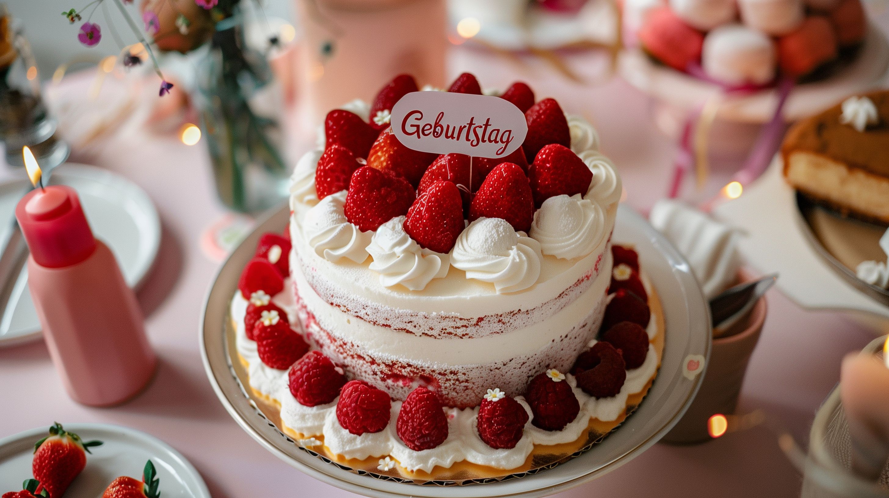 Dieses Foto zeigt eine dekorativ gestaltete Geburtstagstorte, die mit frischen Erdbeeren, Sahne-Cremetoppings und einem pinken Tortenring verziert ist. Die Torte steht auf einem hellen Teller und ist von einem stimmungsvollen Arrangement aus Tannenzweigen, Kerzen und Blumen umgeben. Die farbenfrohe, festliche Optik lässt den Betrachter die Feierlaune und den besonderen Anlass erahnen. Dieses hochauflösende Gratis-Stockfoto eignet sich ideal für Blogbeiträge, Newsletter-Designs, Social-Media-Posts oder andere Werbezwecke rund um Geburtstage, Feiern und die Zubereitung von köstlichen Desserts.